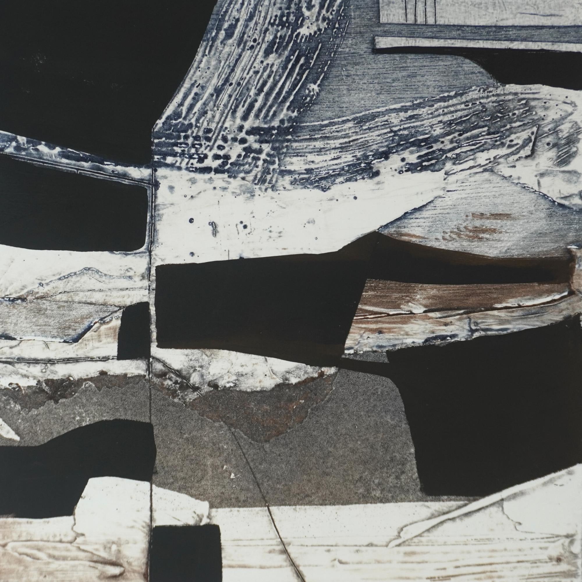 Using plywood as a plate I explore the possibilities of texture and tone. Once printed on a traditional etching press I hand colour and add layers of monotype. As a result, each print is unique.