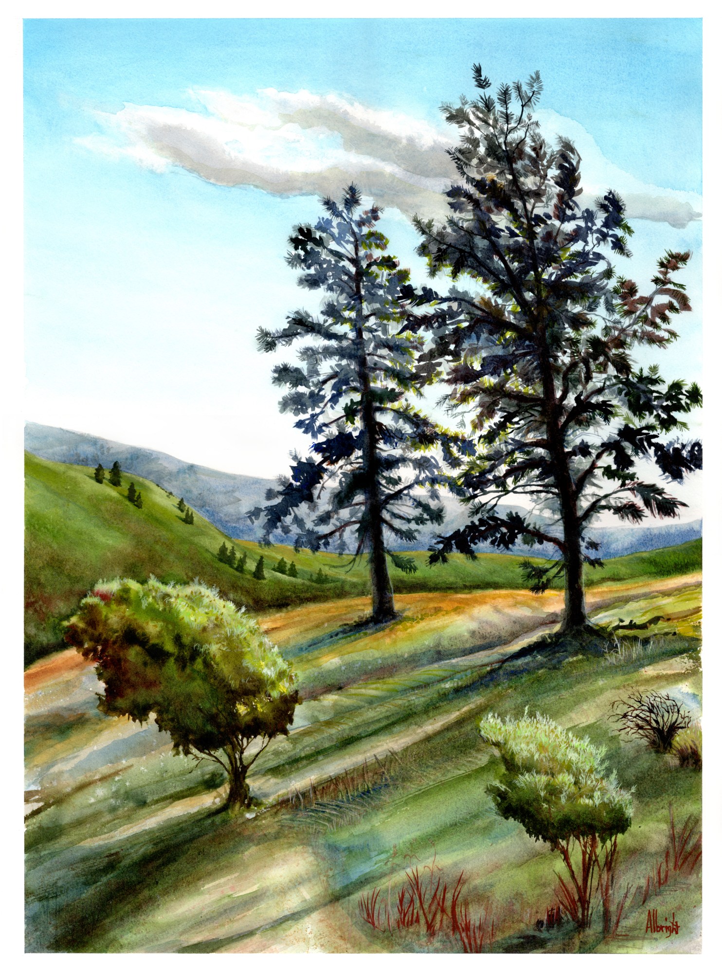 Summer Ponderosa Pines and rabbit brush with long shadows
