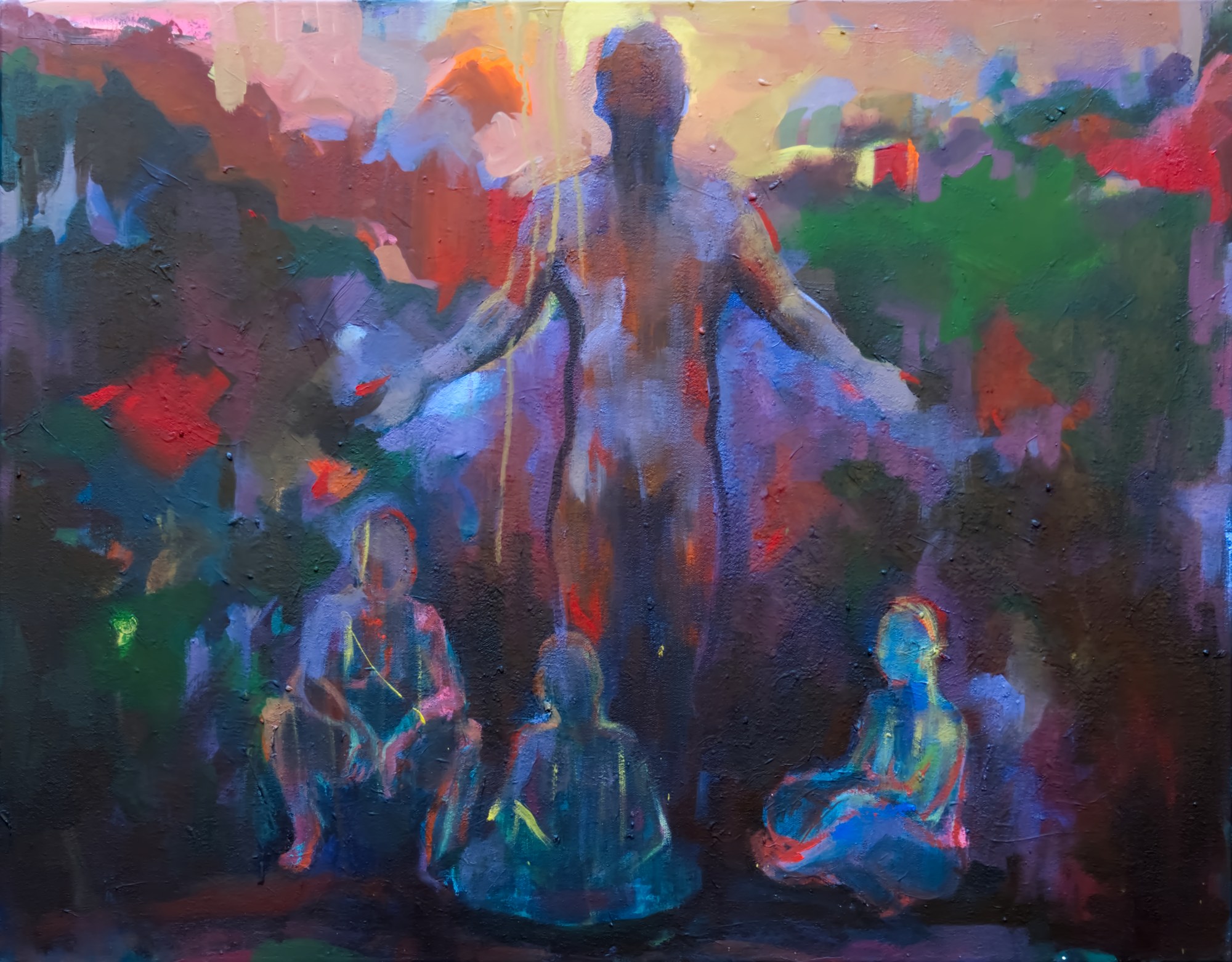 A complex and highly chromatic background surrounds four figures. A more prominent figure with open arms invites the viewer to look closely. The other three with different body postures, one crouching and two crisscrossed on the ground, facing different directions, are vessels of symbolic content carrying an emotional undertone. The play of opposites and colour contrasts balances the composition, with reds exiting and greens calming the eye. Bold strokes create an interesting, chaotic texture reminiscent of the elements. A visual tension is achieved between a play of opposites. The warmth coming forward and coolness residing develop a sense of depth. Light and dark as a Dantesque visit to the underworld. A light source suggests an exit, a resolution, the paint dripping down, connecting all figures. Like in a dream, something obscure wants to unveil itself; voices want to be heard, a gestalt dialogue between elements to find meaning.