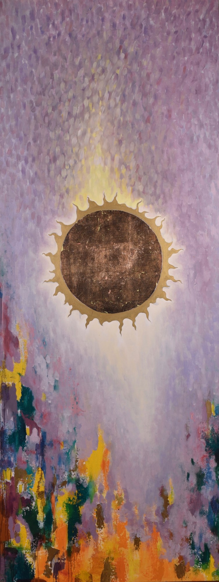 The abstract background represents the journey of the kundalini as it rises through the chakras, activating each one along the way. The brilliant sun is a symbol of the third chakra, associated with our willpower and the ability to move forward in life with intention and purpose.