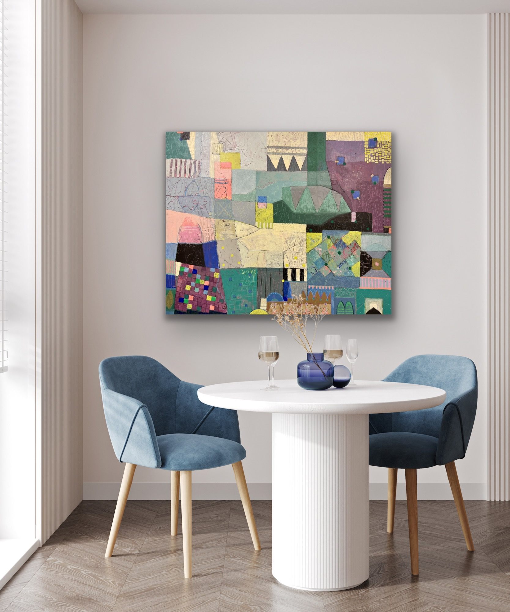 “An abstract city of memory and silence. Domes and arches drift across textured layers — a place that never truly sleeps.” 🎨 Mixed Media on Canvas | 110 × 135 cm