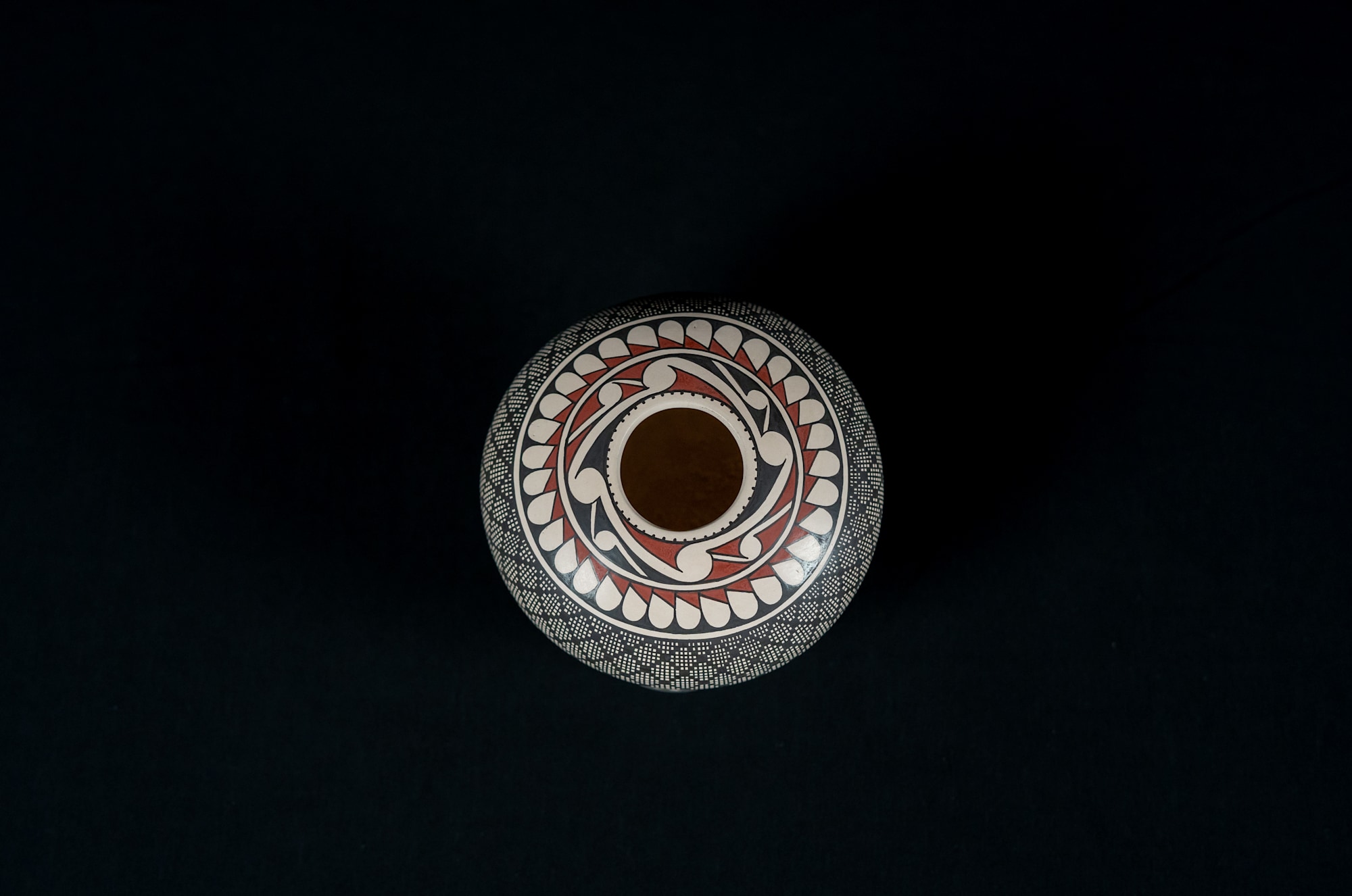 A small black and white, classic style pot with accompanying stand. Handcrafted by Graciela Gallegos in Mata Ortiz, Chihuahua, Mexico.