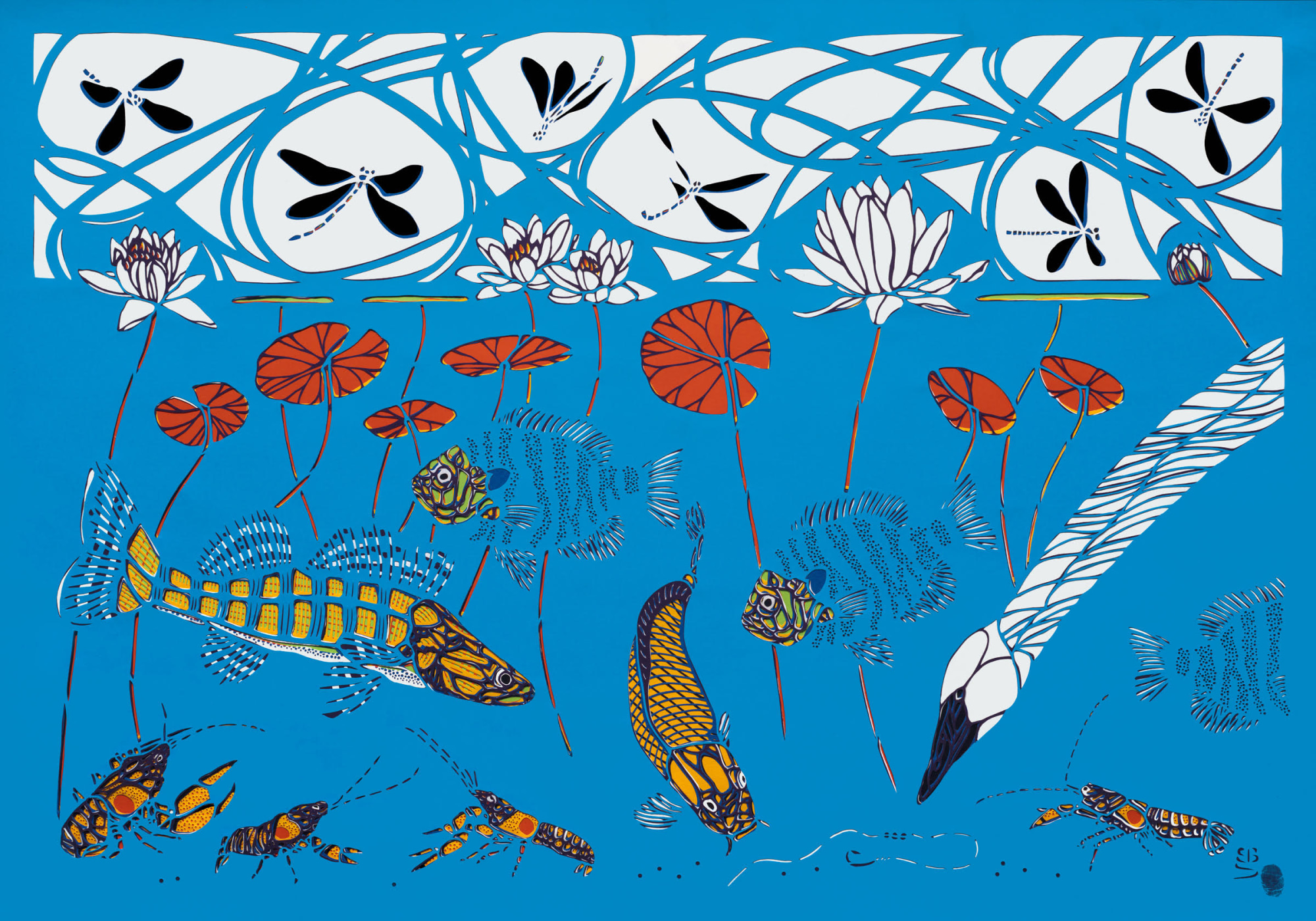 This is a very large, intricate, multi-layered papercut depicting species found in the headwaters of the Mississippi River. It is the first of a series depicting the Mississippi River from the headwaters to the Gulf. It is available in high quality giclee print. The original is extremely fragile, and could only be sold to a very dedicated and knowledgeable collector.