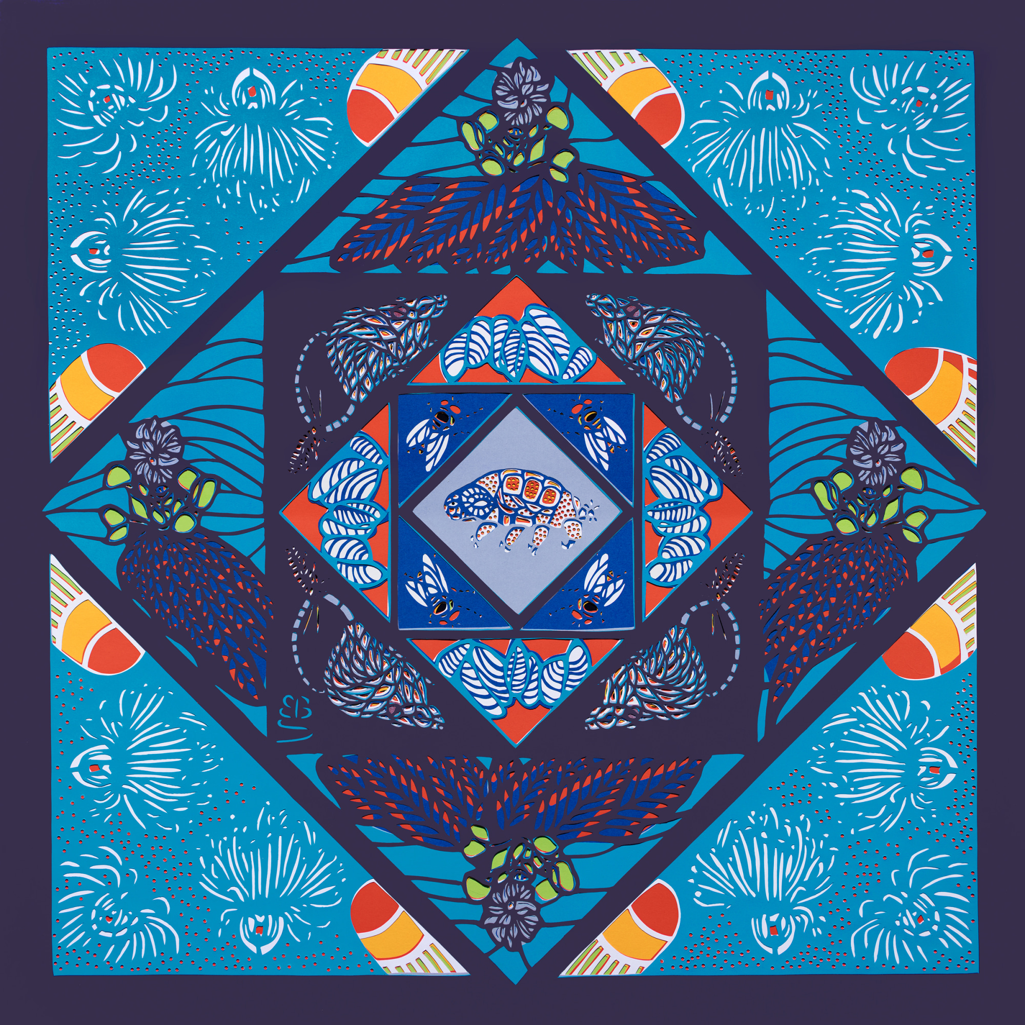 Eight layers of scissors-cut paper form a mandala desig,n featuring species that might be able to survive a global environmental catastrophe. Starting in the center, and working out, the species are: Tardigrade sp. (Water bear); Musca domestica (Housefly);