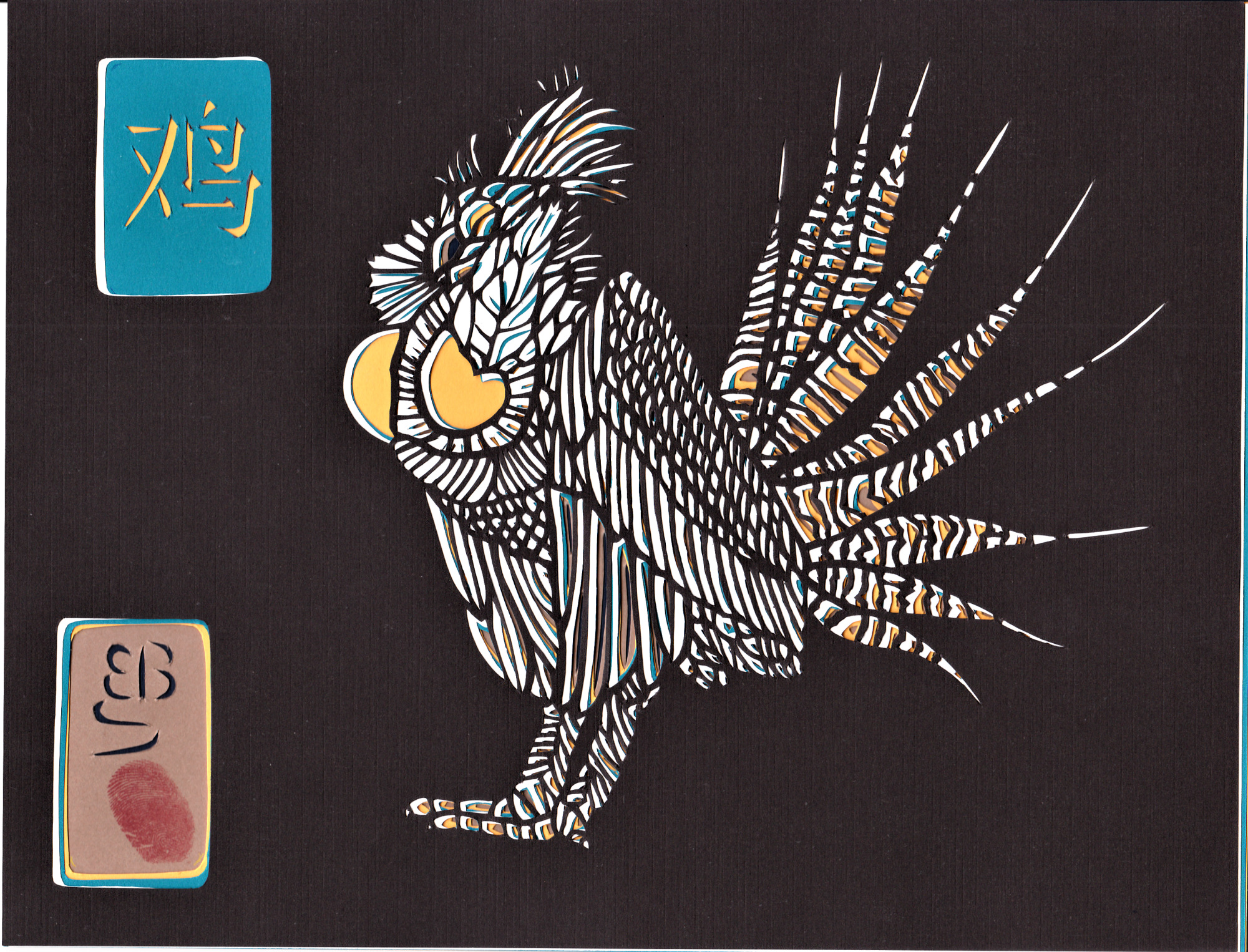 This is a six-layer papercut from the series, "Endangered Chinese Zodiac." The subject is a Gunnison's Sage Grouse, Centrocercus minimus.