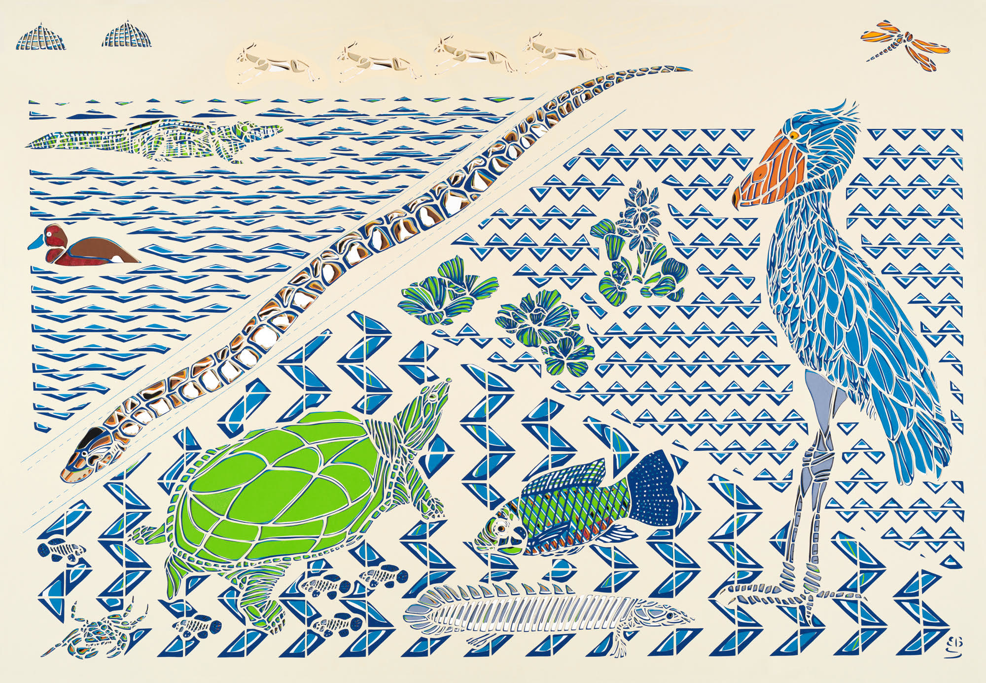 Eleven layers of colored paper, cut with scissors so the underlying layers show though. Depicting species that are endemic to the Sudd, including: Mongalla Gazelle; Wandering Glider (dragonfly); Nile Crocodile; Shoebill stork; Ferruginous duck;