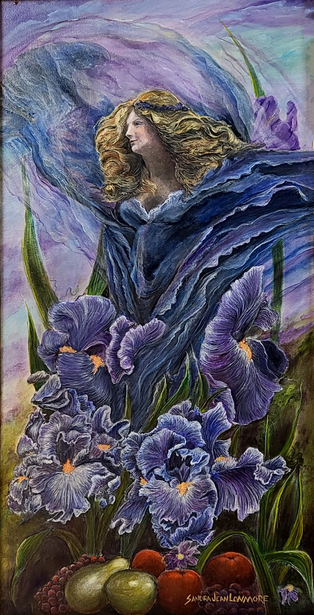 What truly brings this piece to life is what lies at her feet. A vibrant carpet of Iris flowers, their petals alive with movement as though they're dancing in the breeze, mirrors her own exuberance. Surrounding these flowers, a bountiful harvest unfolds – ripe apples, succulent pears, and plump grapes. This lush tableau represents the flourishing rewards of nature's bounty, and it's as if the woman's excitement is in perfect sync with the rich harvest before her. The painting encapsulates the pure delight and connection we can find in the beauty of both the natural world and our own inner joy.