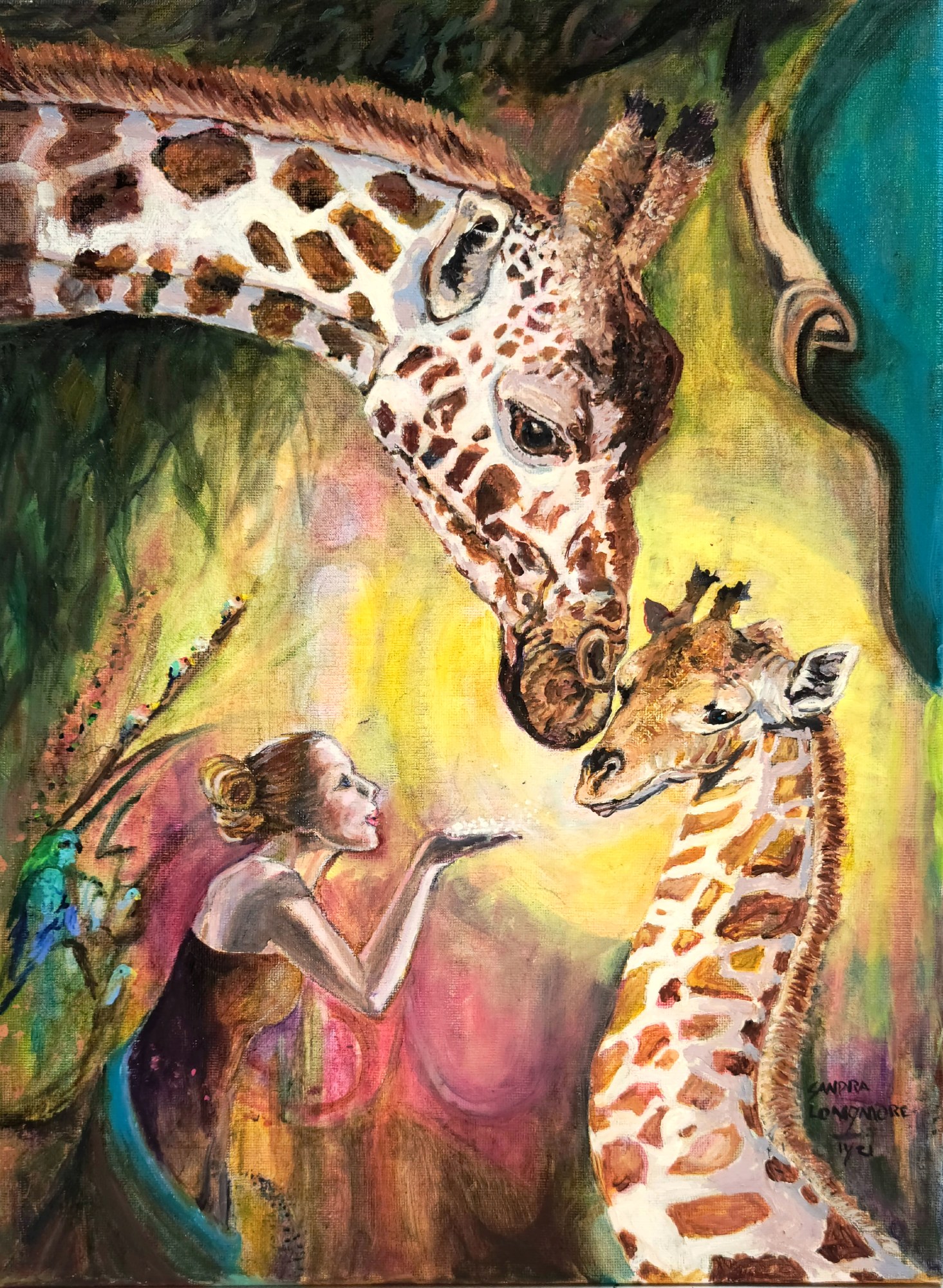 This painting is part of a larger series, where each piece showcases the angelic woman in a different setting, surrounded by different animals and landscapes. The process of creating these paintings has allowed me to explore the powerful connections that exist between humans and nature.