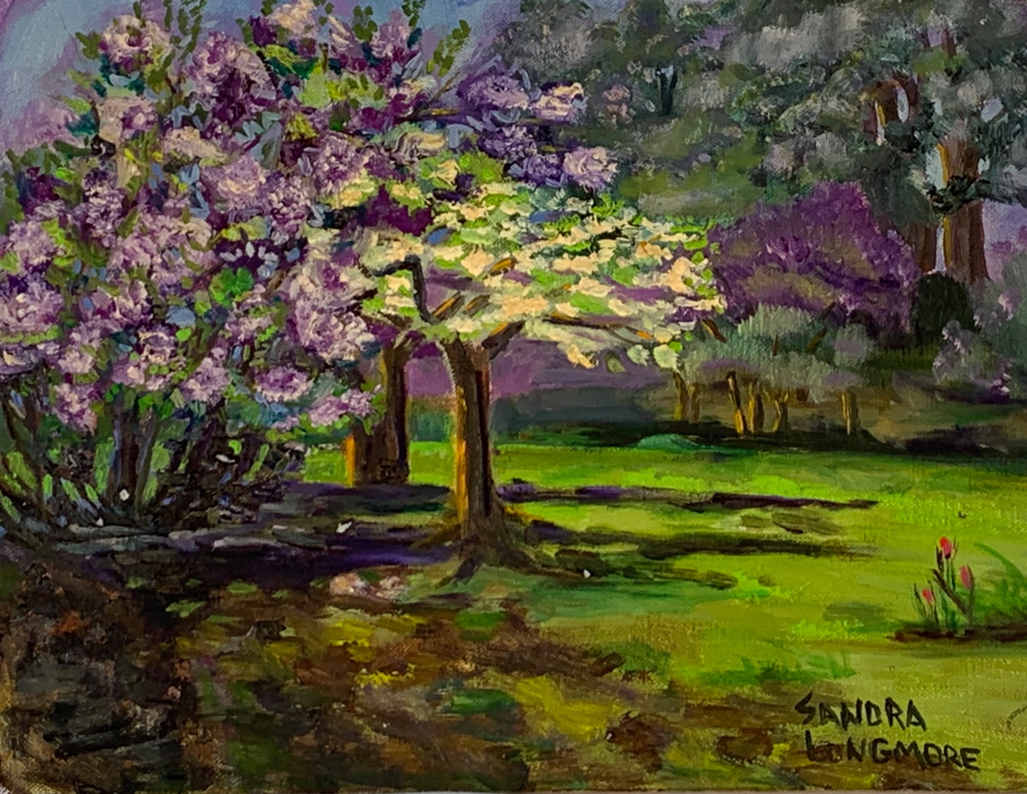This painting represents a love story full of challenges and deep determination of the people who love lilacs. The story started long ago around 1880 with a Victorian Farmhouse and country gardens that now comprise the Hulda Klager Lilac Gardens. The national historic site is located in Woodland, Washington. You will have to go to the gardens to get the full feel for happened on this land that brought people together to preserve this lovely site. I went to the lilac gardens with several other painters one sunny weekend and painted and felt how deep this historic site went into me and my painting. I stayed all day painting, walking, and taking in the scent of lilacs. It is one of my very pleasant memories.