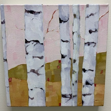 I focus primarily on movement, color and the texture of the paint in my practice, I’m always looking for new ways to create form. While my work has become increasingly abstract in recent years, the focus on color and pattern as a central component has remained a constant. The same black and white checks that once lined the edges of dishes in a still life now define abstract shapes, creating vertical compositions of tree-like figures. My palette is unique to my work and acts as a common thread as the subject matter (or lack thereof) evolves. The interaction of color, pattern, texture and form creates a harmonious rhythm, keeping the eye constantly moving throughout the composition. I continue expanding my exploration of color and texture, incorporating tissue paper, collage, woodblock prints, and various forms of mixed media in my work. I hope my work conveys a mood, delights the eye, and captures the whimsical nature of life.