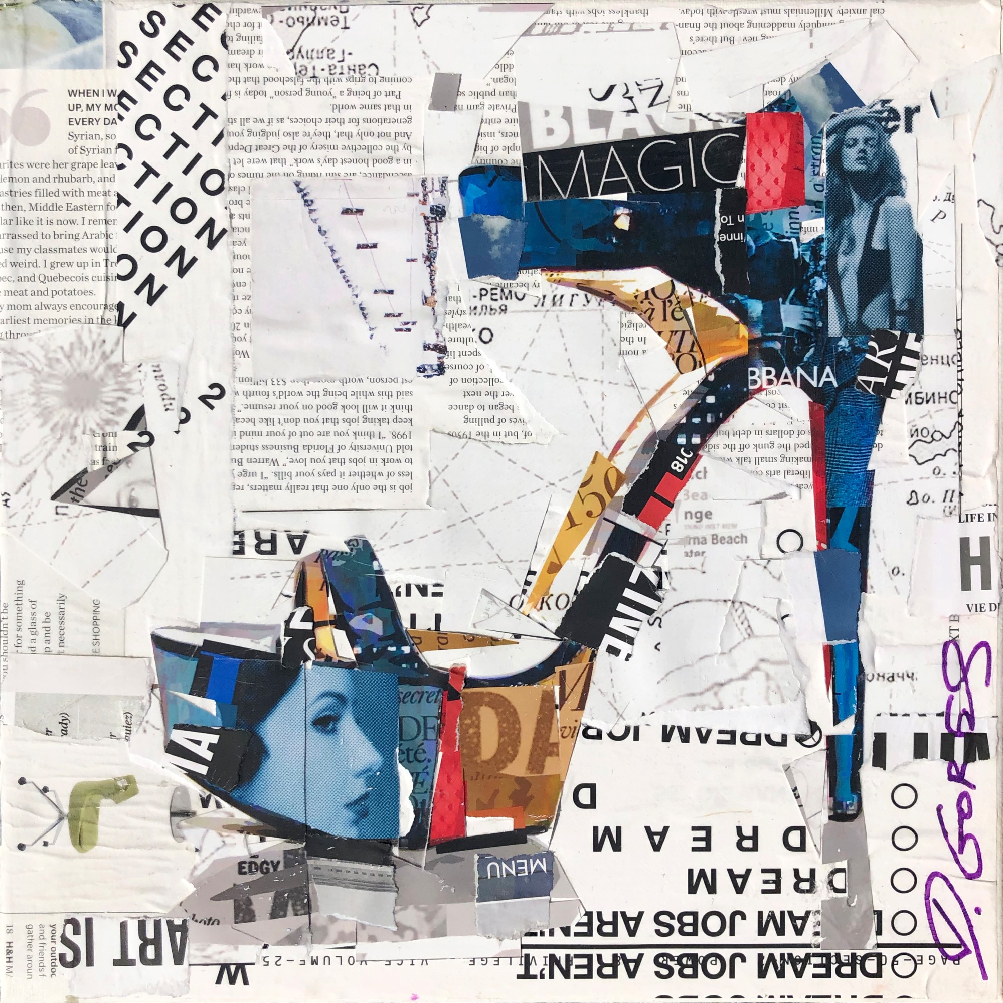 Derek Gores creates his lush portraits in collage out of recycled magazines, maps, advertisements and any other paper goods he can get his hands on. Considered part of the New Contemporary Movement, his work has a post-warhol sensibility that in a new context, even the disposable magazine can contribute to a lasting moment. His works are one thing from afar, but as the viewer gets closer the image melts into a utopia of poetic moments - often the opposite of what we thought we understood from across the room.