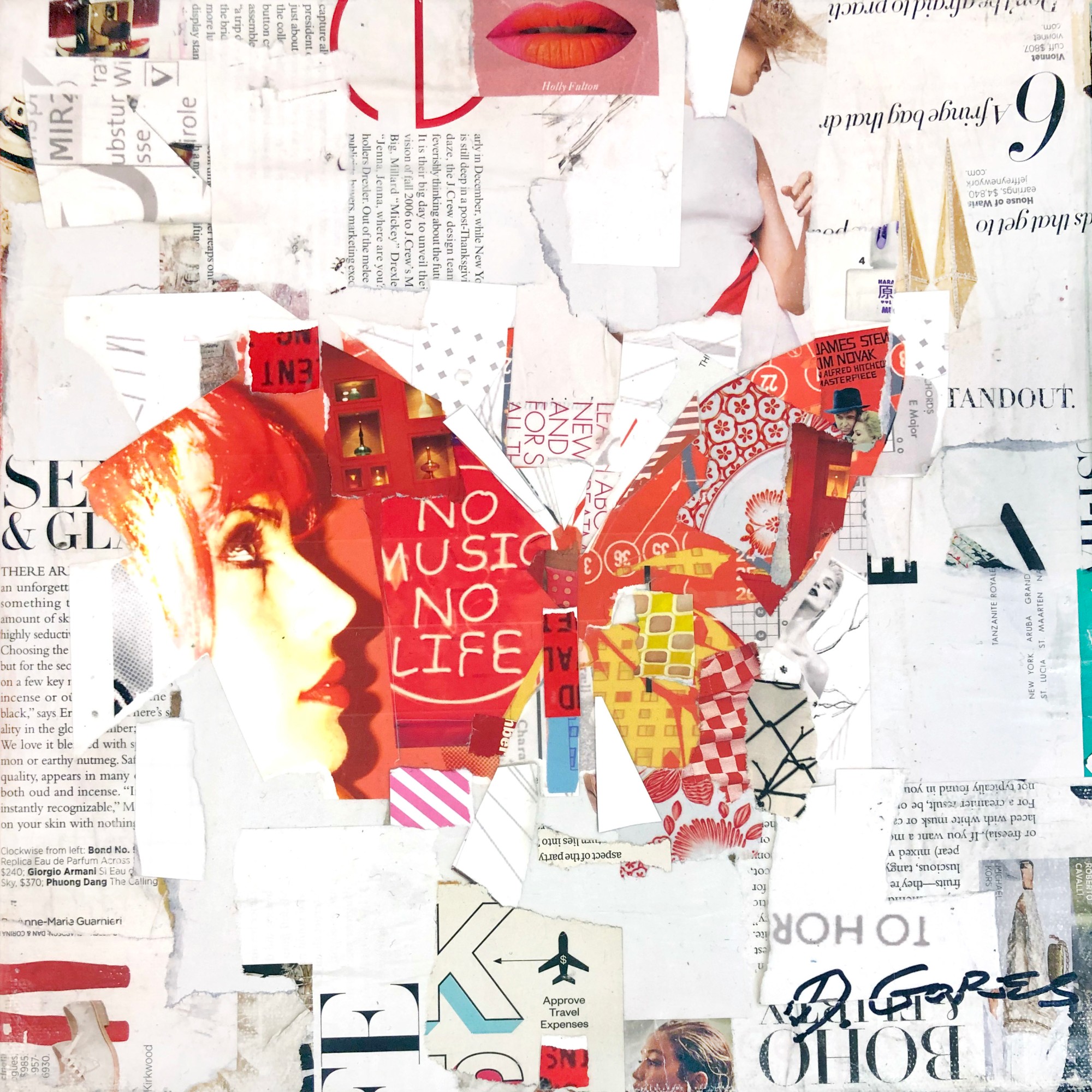Derek Gores creates his lush portraits in collage out of recycled magazines, maps, advertisements and any other paper goods he can get his hands on. Considered part of the New Contemporary Movement, his work has a post-warhol sensibility that in a new context, even the disposable magazine can contribute to a lasting moment. His works are one thing from afar, but as the viewer gets closer the image melts into a utopia of poetic moments - often the opposite of what we thought we understood from across the room.
