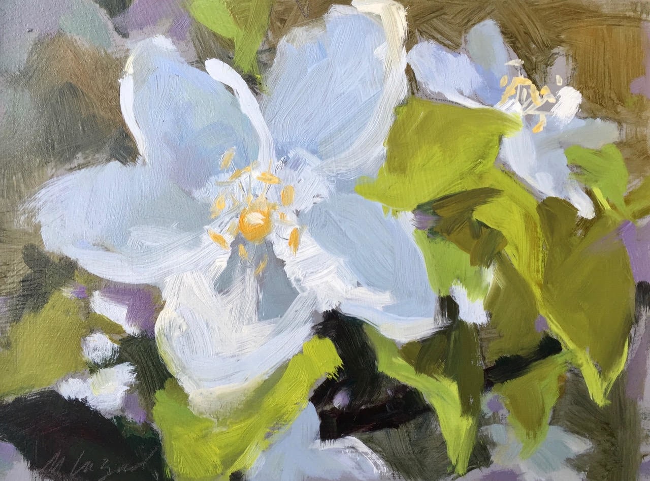 This painting is one of Monique Lazard's exquisite and painterly floral still lifes. The density of paint she applies to her canvases is belied by her light, airy brushwork. Featuring lush flowers like peonies, roses, ranunculus and bell flowers, Monique's small, framed canvases provide a dose of freshness and elegance to any room. They look gorgeous alone or when displayed in multiples.