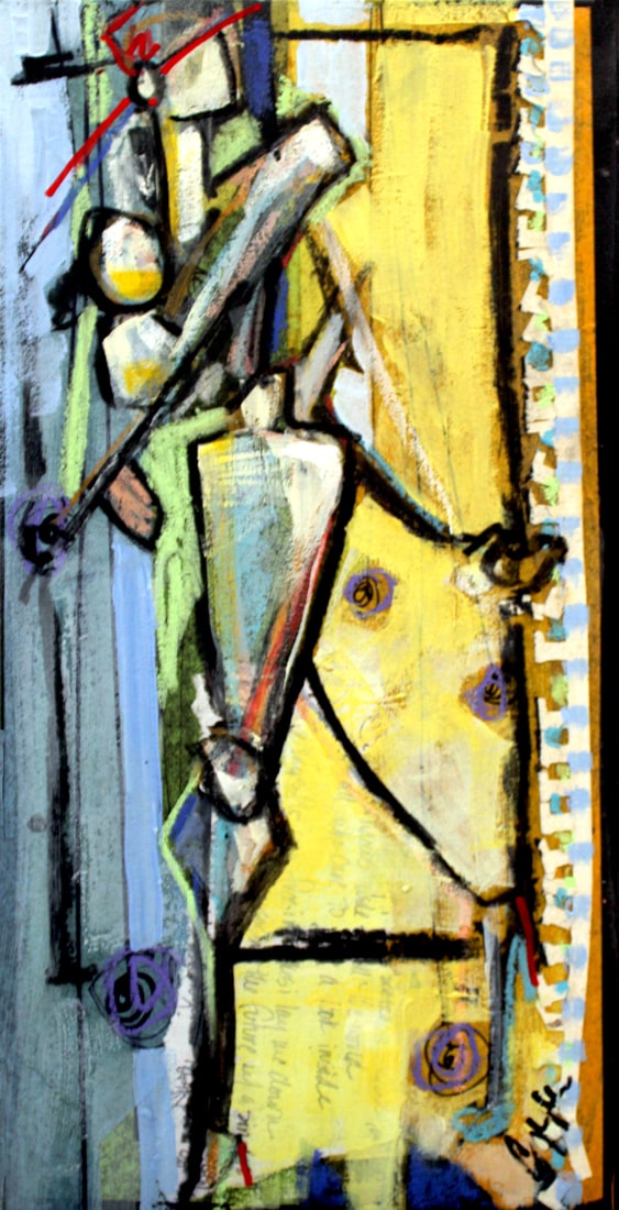 12" x 6" mixed media with oil and cold wax on birch panel, in a black floater frame.