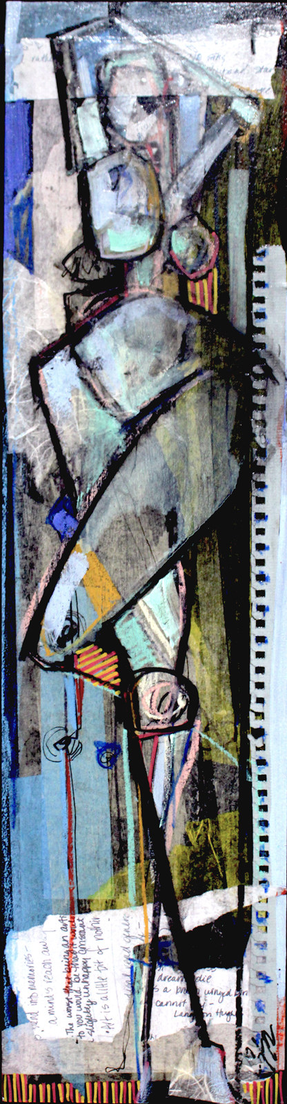24" x 6" mixed media with oil and cold wax on canvas, in a black floater frame.