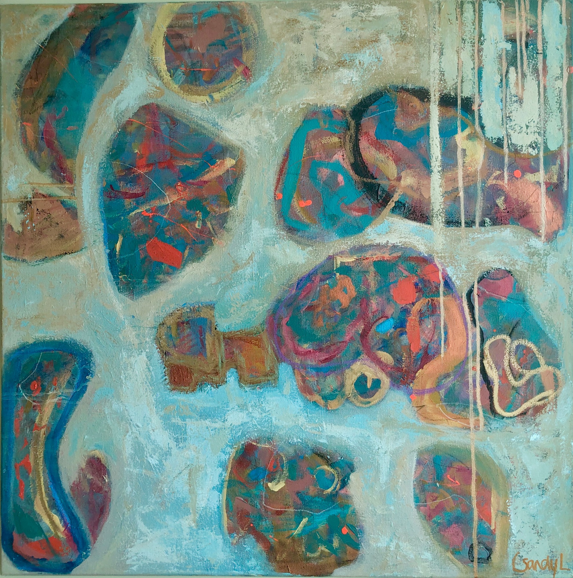 This piece is all about letting yourself fall apart, letting it all out, picking up the pieces with care and tenderness, nurturing them back together again and throwing away what you don't want to keep. It is a very raw piece, full of colour and emotion. One you can stare at for ages. Especially if the sunlight is shining on it and you can catch the metallic accents that give this piece so much life.