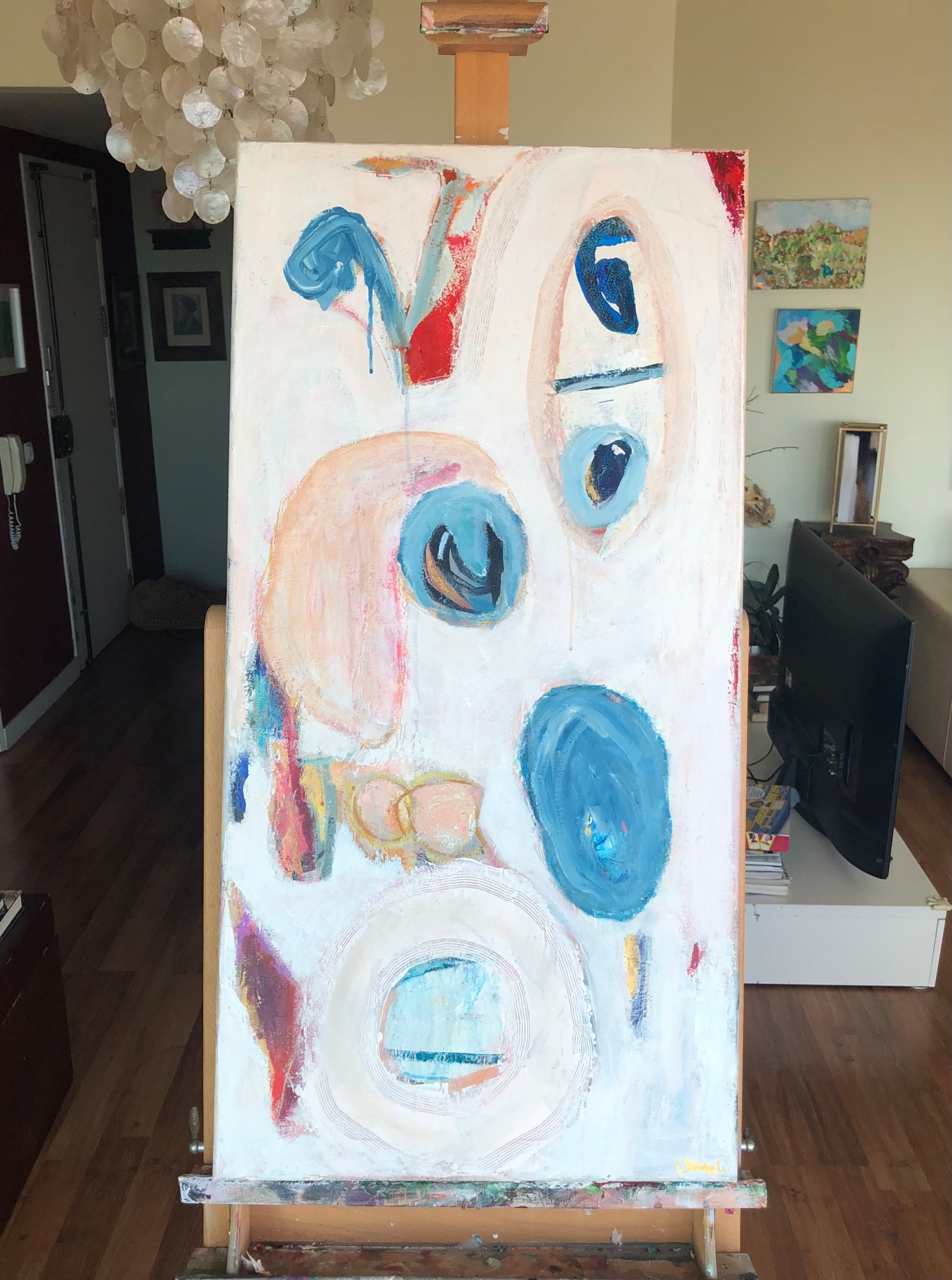 This piece is titled "There Is No End", as it is an older painting that was reworked, and if I look at in longer and closer, I could maybe change something else. I'm happy with it now, as I felt there was something missing, a lack of harmony, but I could go on. It is frightening how sometimes something is perfect, but as the days go by, your feelings towards it change and it can become imperfect, needing change. Other situations in your life change, there seems to be an end, but is there? Nothing disappears, nothing ends, and things just evolve and transform. Like this painting.