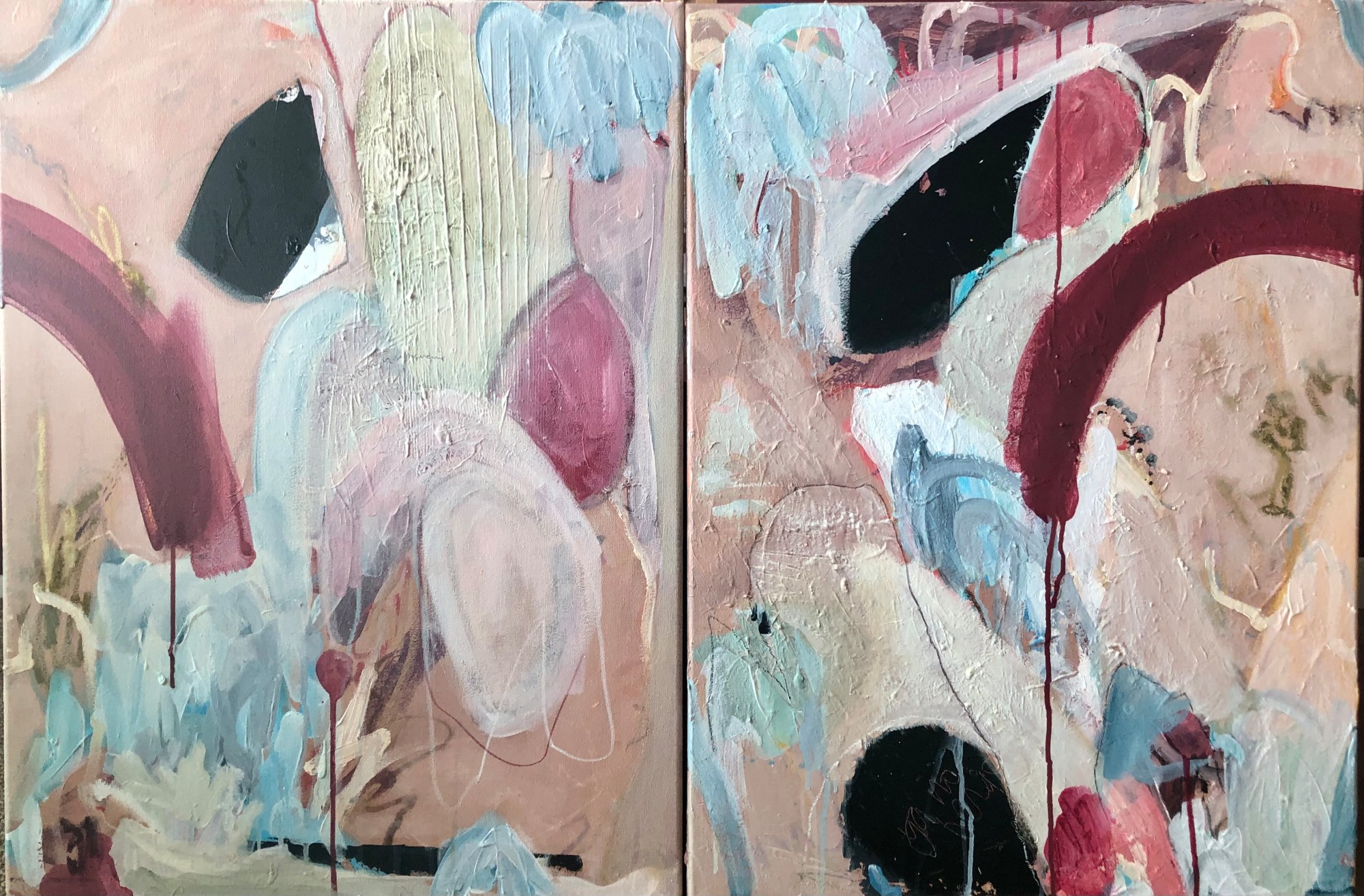 This painting represents the artist honing in back on herself after a brief period of deep introspection and stripping back to the core. Having brought herself back to her essence internally, the time was right for beginning to externalise and share that essence. "Wake Up From Your Reverie", is, in fact, a re-awakening, where the colours, shapes and strokes painted onto this diptych, manifest the return to joy, simplicity, intuition, warmth, serenity and hope, always hope.