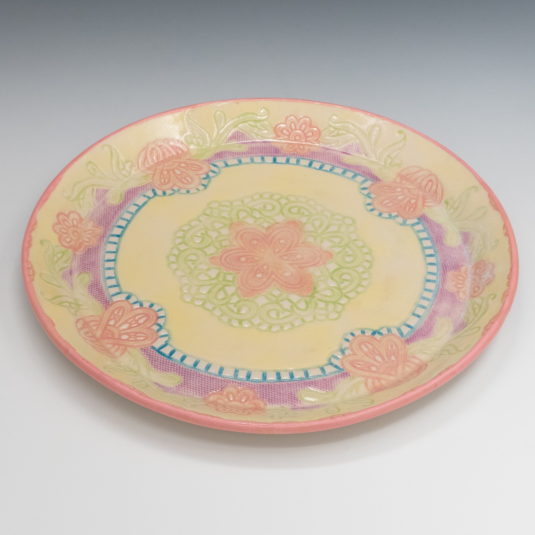 Handbuilt slab construction created on a beveled hump mold; Impressed doily design; Underglazes hand painted on then sponged back to reveal the design; Dipped overall glaze. Cone 6 mid-fire clay fired in oxidation to 2200ºF.