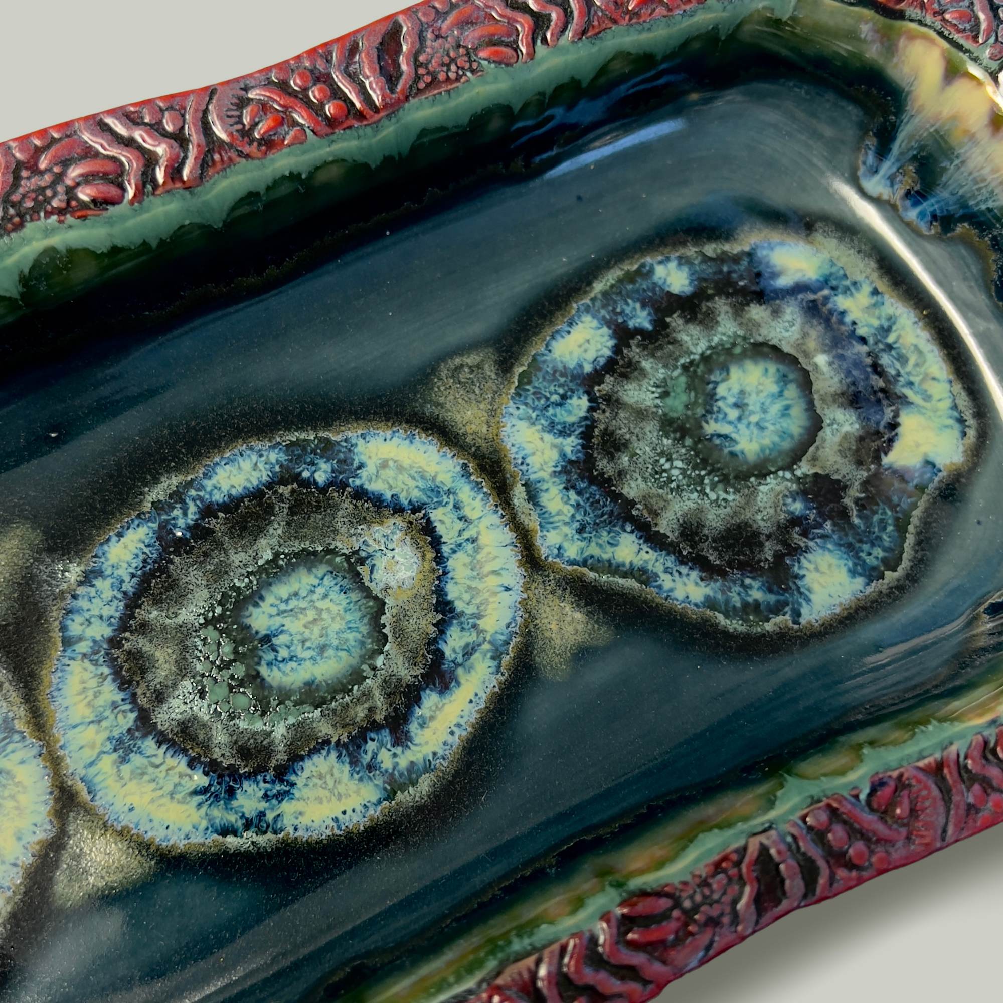 This piece is food-safe, dishwasher safe and microwavable. One of a kind, unique designs reflect the artist’s observation of nature and years of scuba diving, plant life, textures and terrain.
