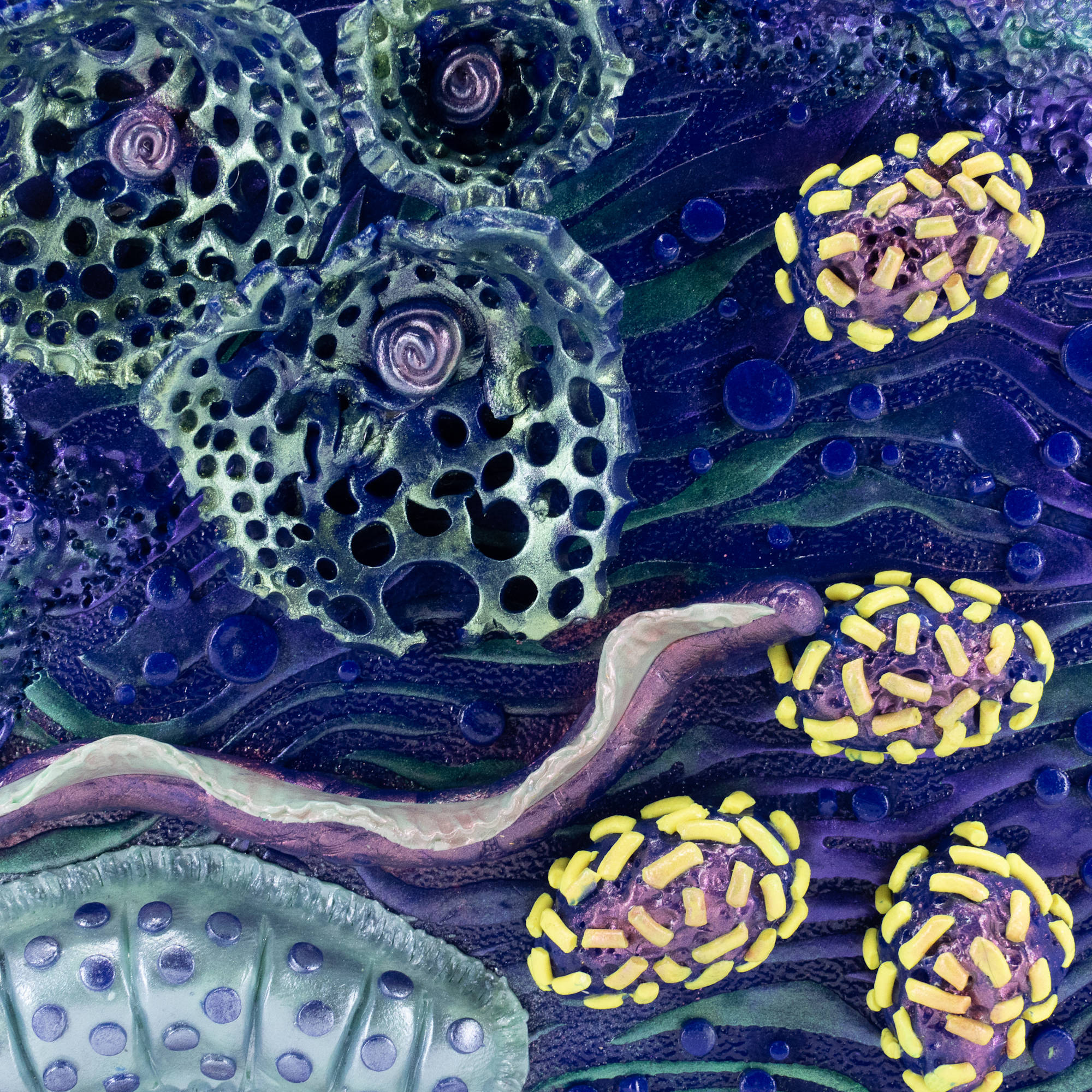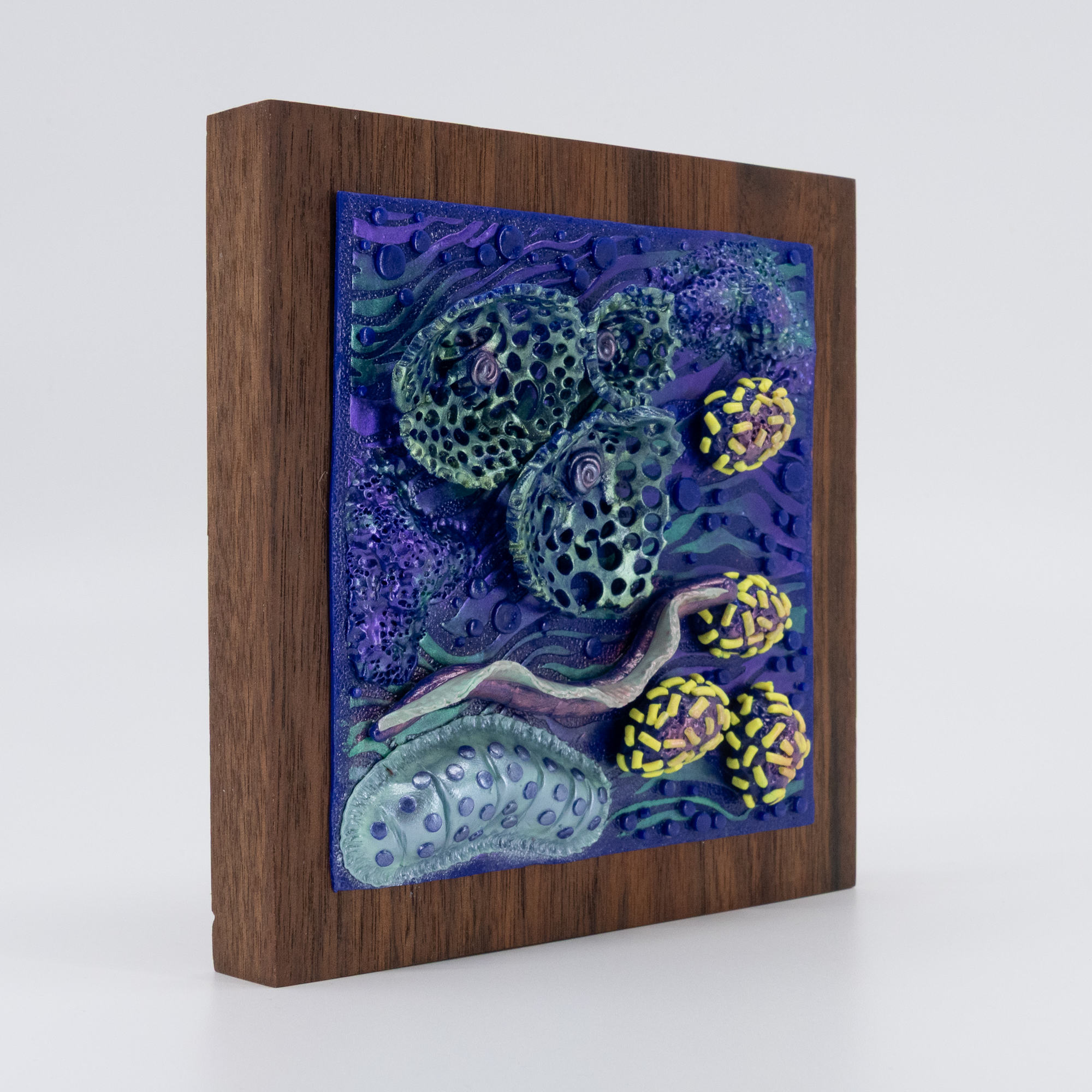 Polymer clay, handmade and textured, mica powders and painted with metallic acrylics. Protected with a clear varnish suitable for polymer clay. Mounted on walnut wood, stained with tung oil to bring out the grain. Made to hang with two nails.