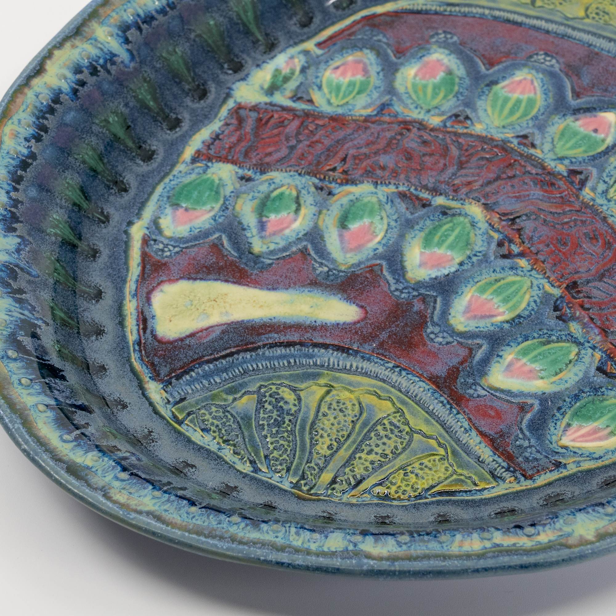 Handbuilt slab construction; Carved and impressed design elements & Slip trailed; Hand painted underglazes, glaze trailed and dipped overall glaze. Cone 6 mid-fire clay fired in oxidation to 2200ºF.