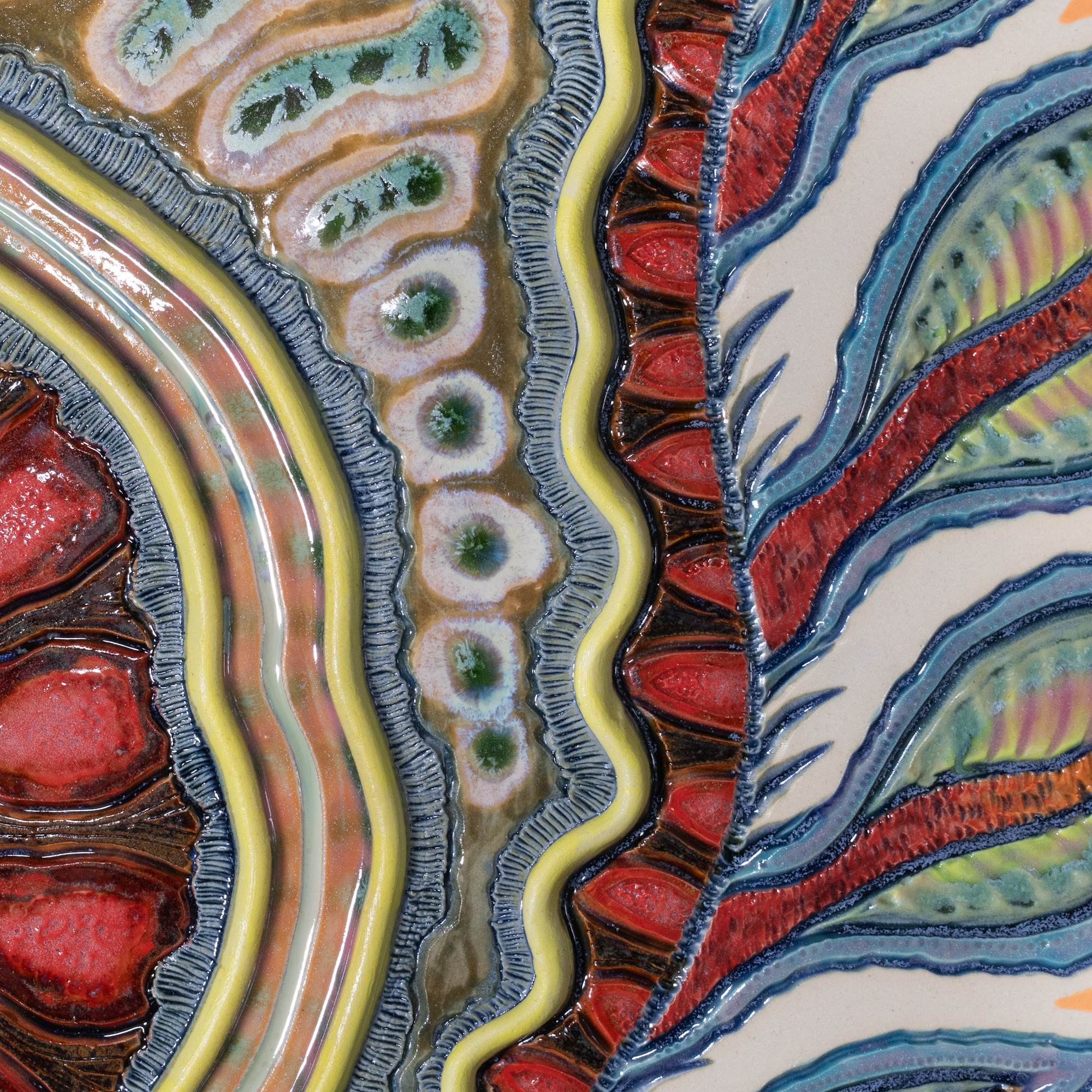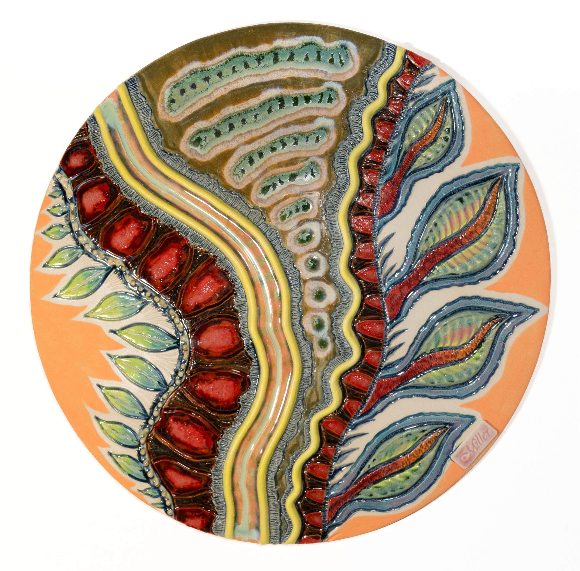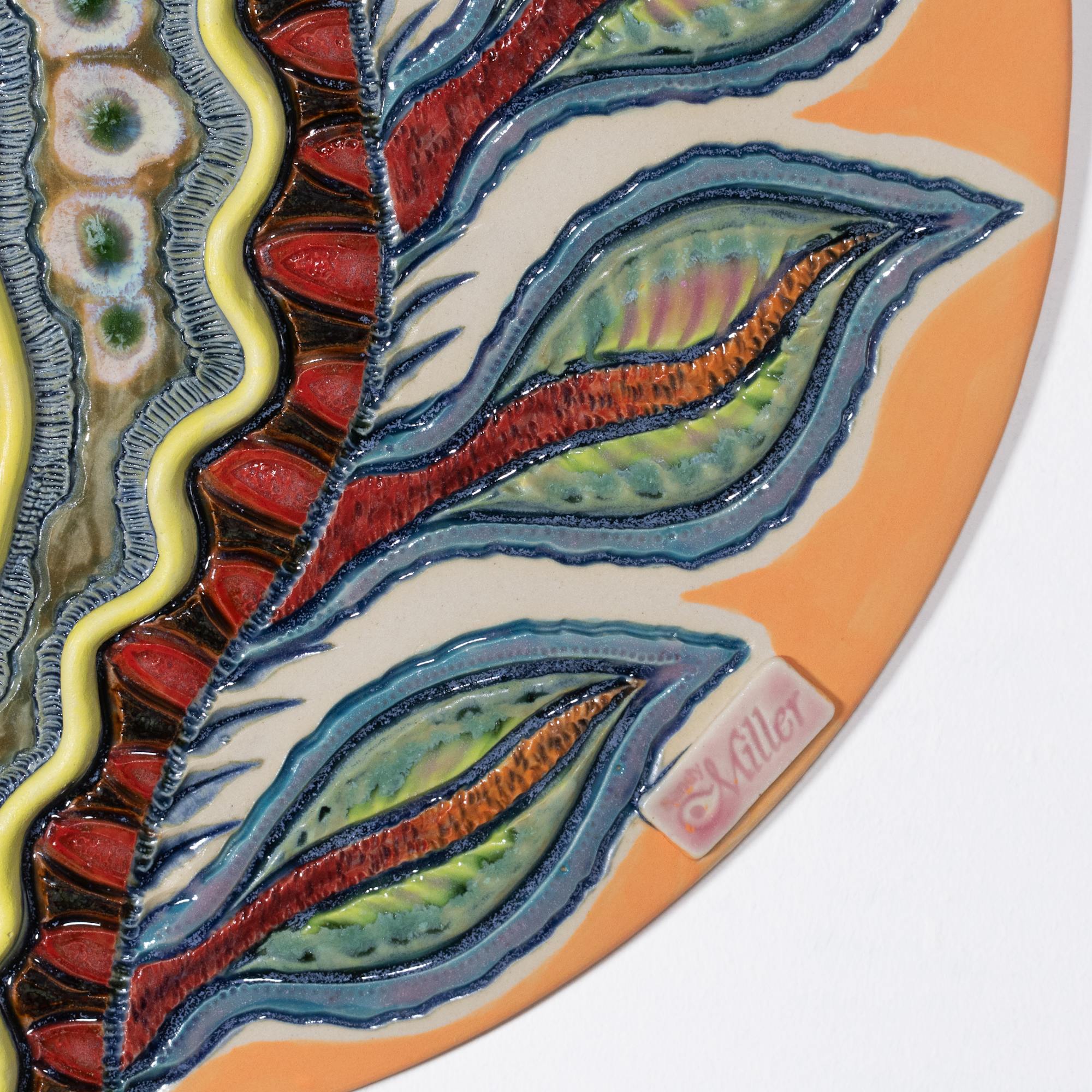 Original art with carved details; clay appliqués; hand painted underglaze in various areas; and multiple applications of glaze trailing in selected areas.