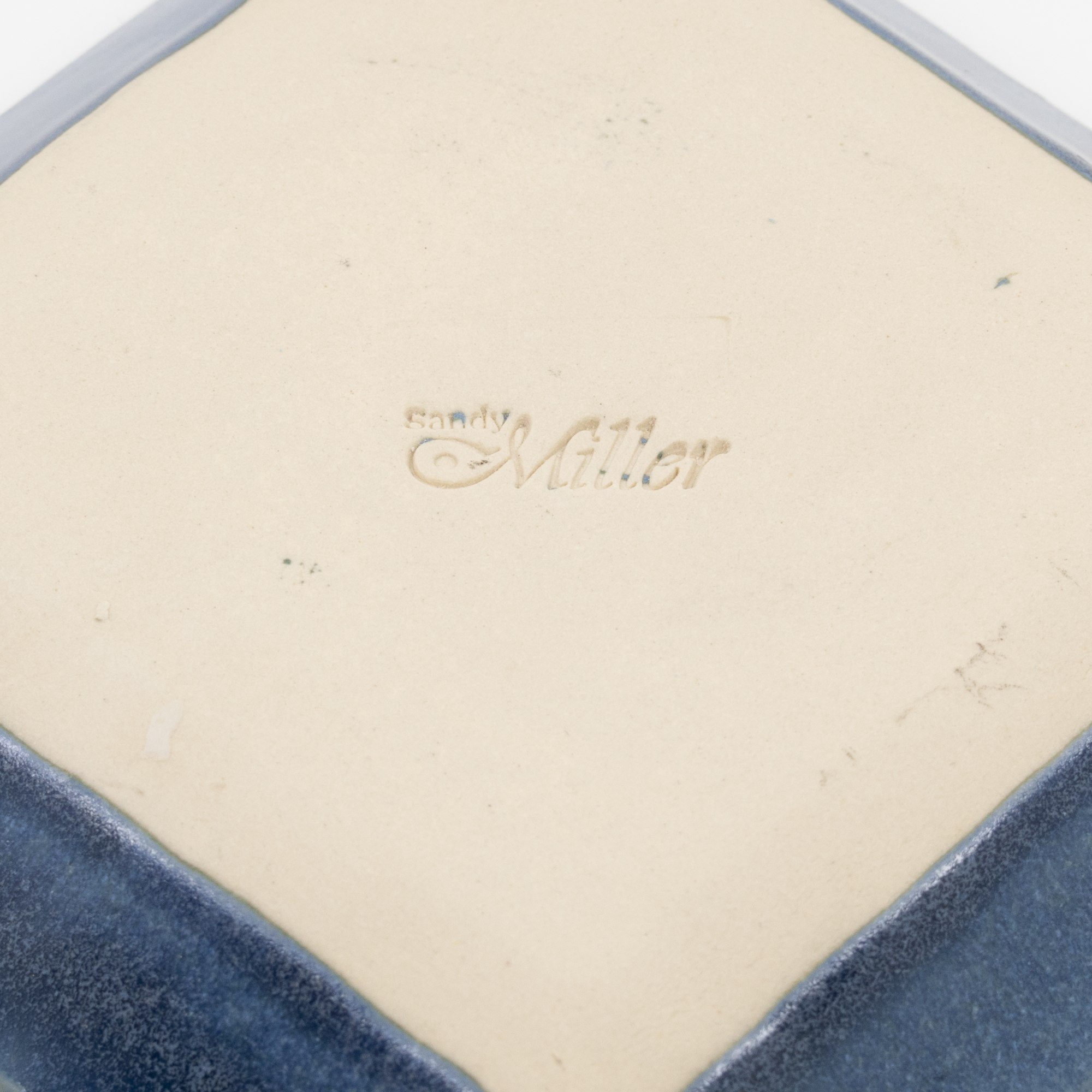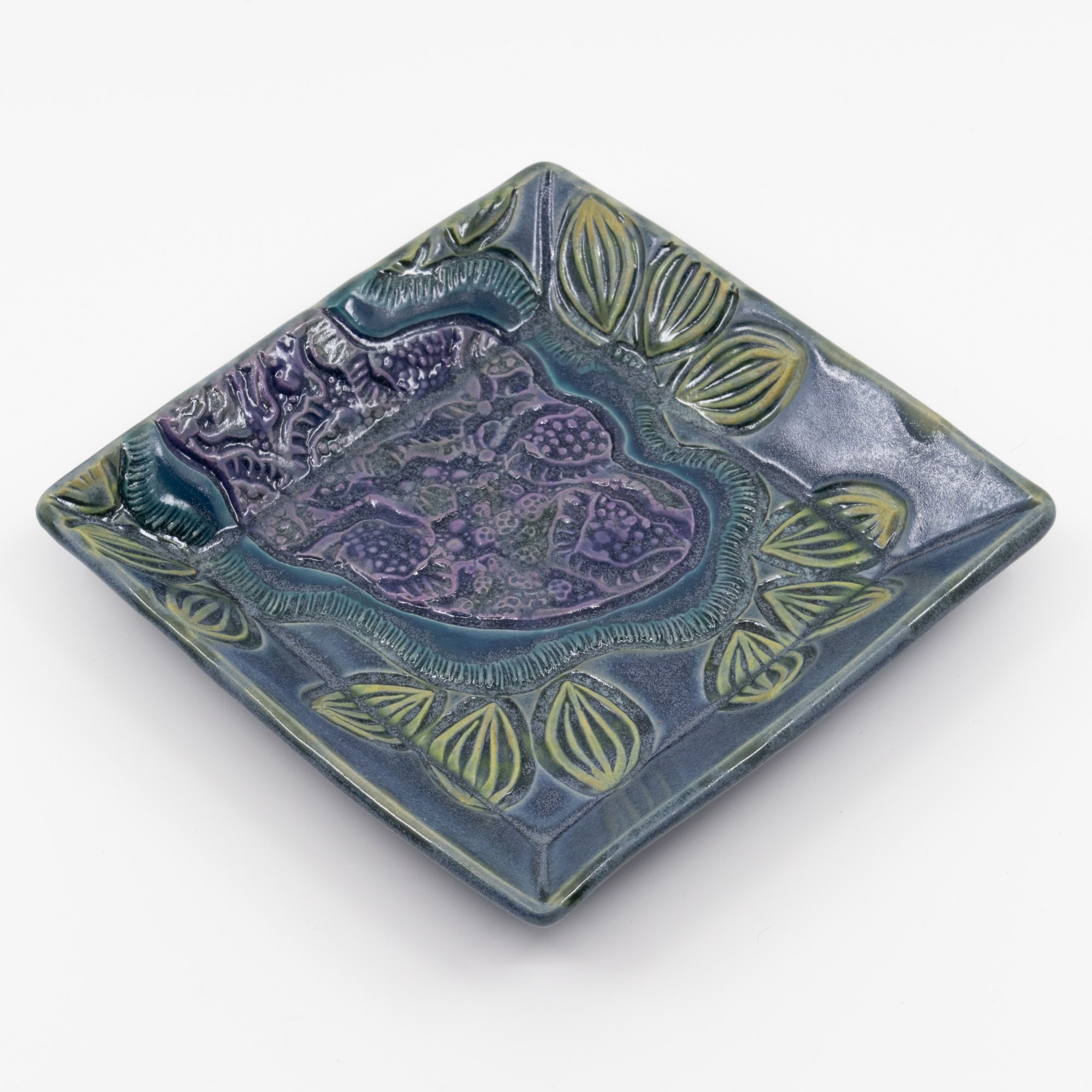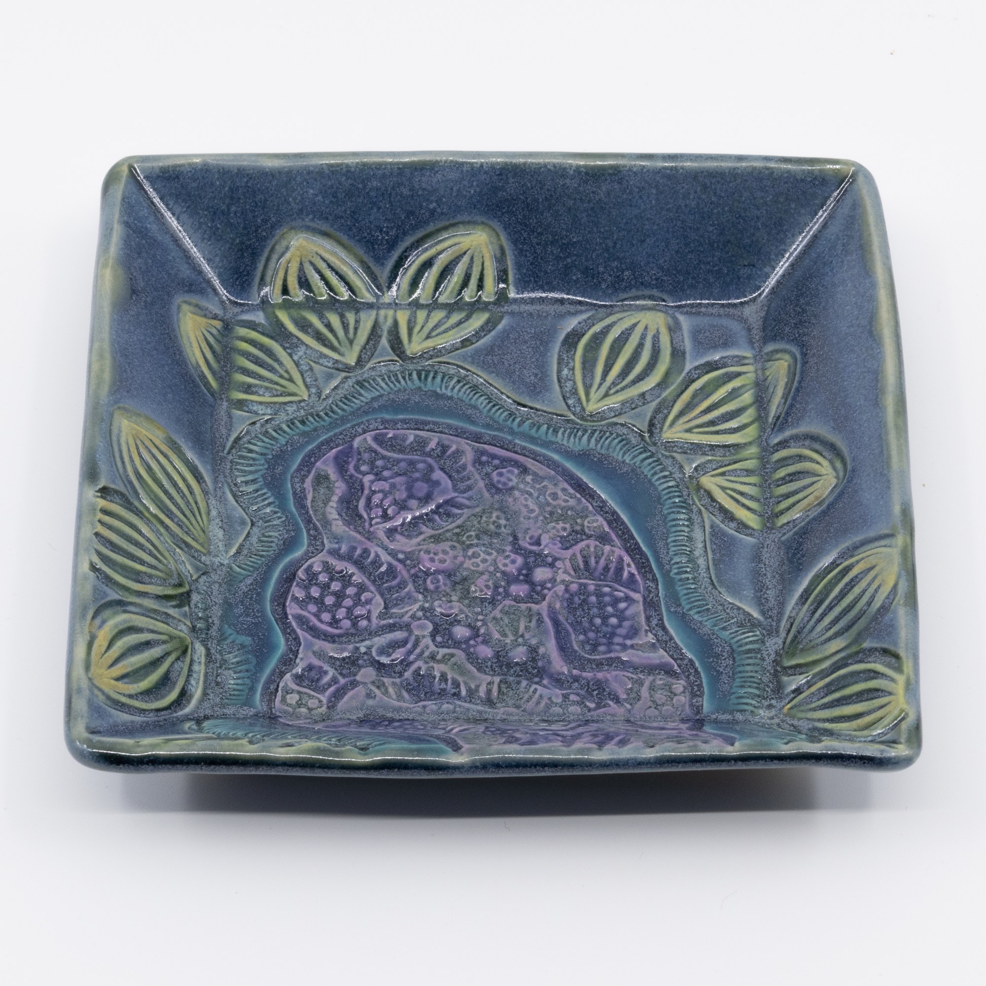 Handbuilt slab construction; Carved and impressed design elements; Hand painted underglazes, glaze trailed and a final dip of a overall glaze. Cone 6 mid-fire clay fired in oxidation to 2200ºF. This piece is food-safe, dishwasher safe and microwavable.
