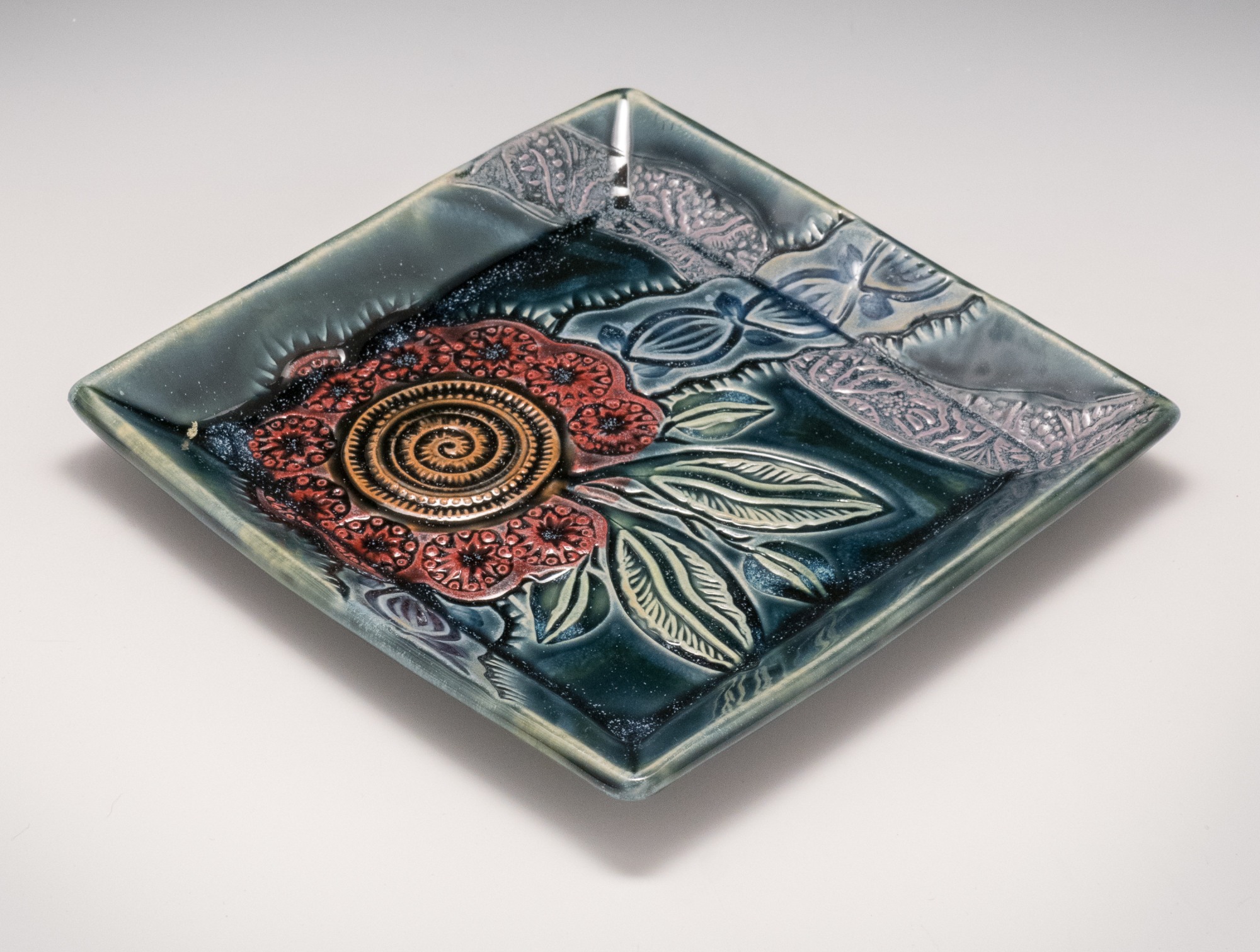 Handbuilt slab construction created over a drape mold; Decoration in construction process: carved and impressed design elements; Glaze decoration process: hand painted underglazes, glaze trailed and dipped overall glaze. Cone 6 mid-fire clay fired in oxidation to 2200ºF.