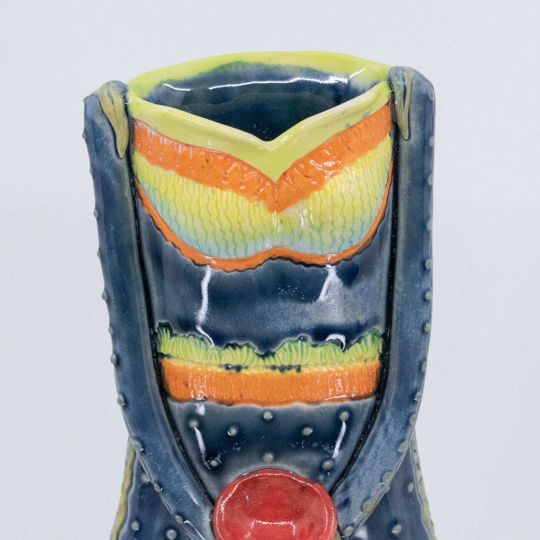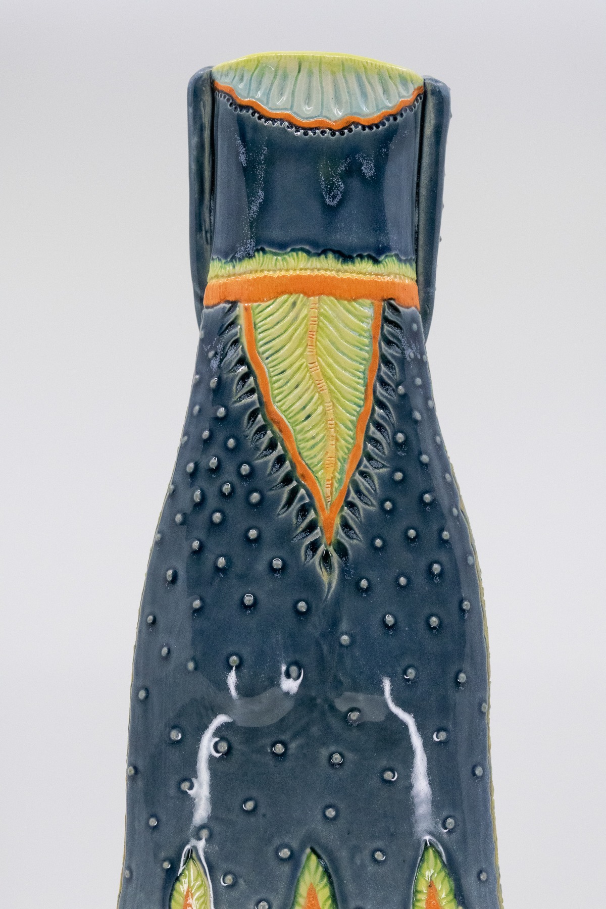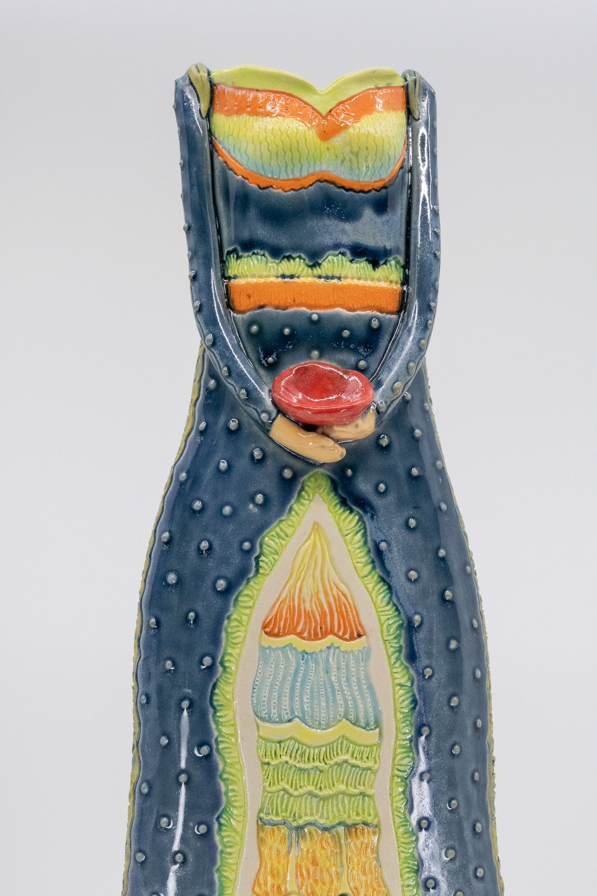 Slab construction with cone 6, B-Mix Clay. Hand-carved intricate, original design, with stamped impressions on the sides. Front and back carved details are ideal for displaying in a location to be seen from all sides. Underglazes hand-painted on and wiped back in some areas to enhance the texture.