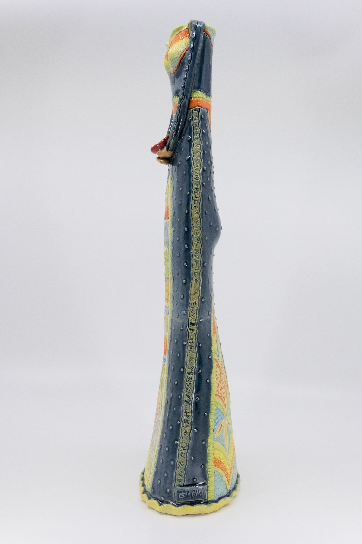 Tall and slender lady with a vase opening (2" x 1") for holding items like a few longer stemmed flowers (tulips, daisies, roses, gladiolus, baby's breath, Queen Anne's lace, etc.) or long ostrich or peacock feathers.