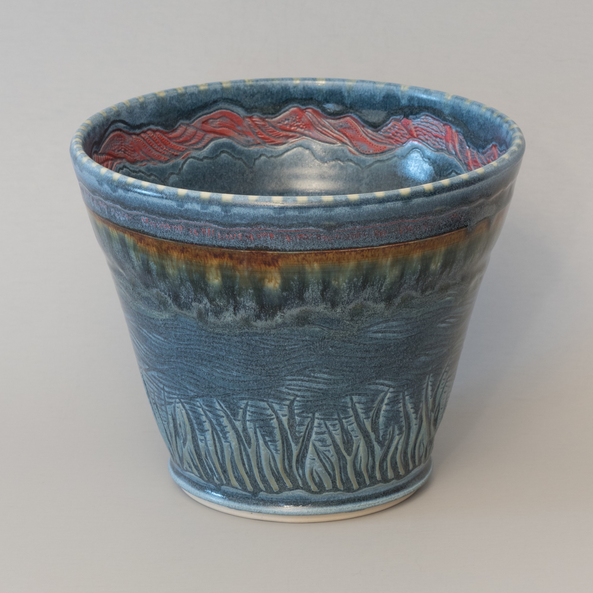 Wheel thrown construction; Decoration in construction process: hand carved; Decoration in glazing process after the first (bisque) firing: hand painted underglazes, glaze trailing and a final dip of an overall glaze. Cone 6 mid-fire clay fired in oxidation to 2200ºF.