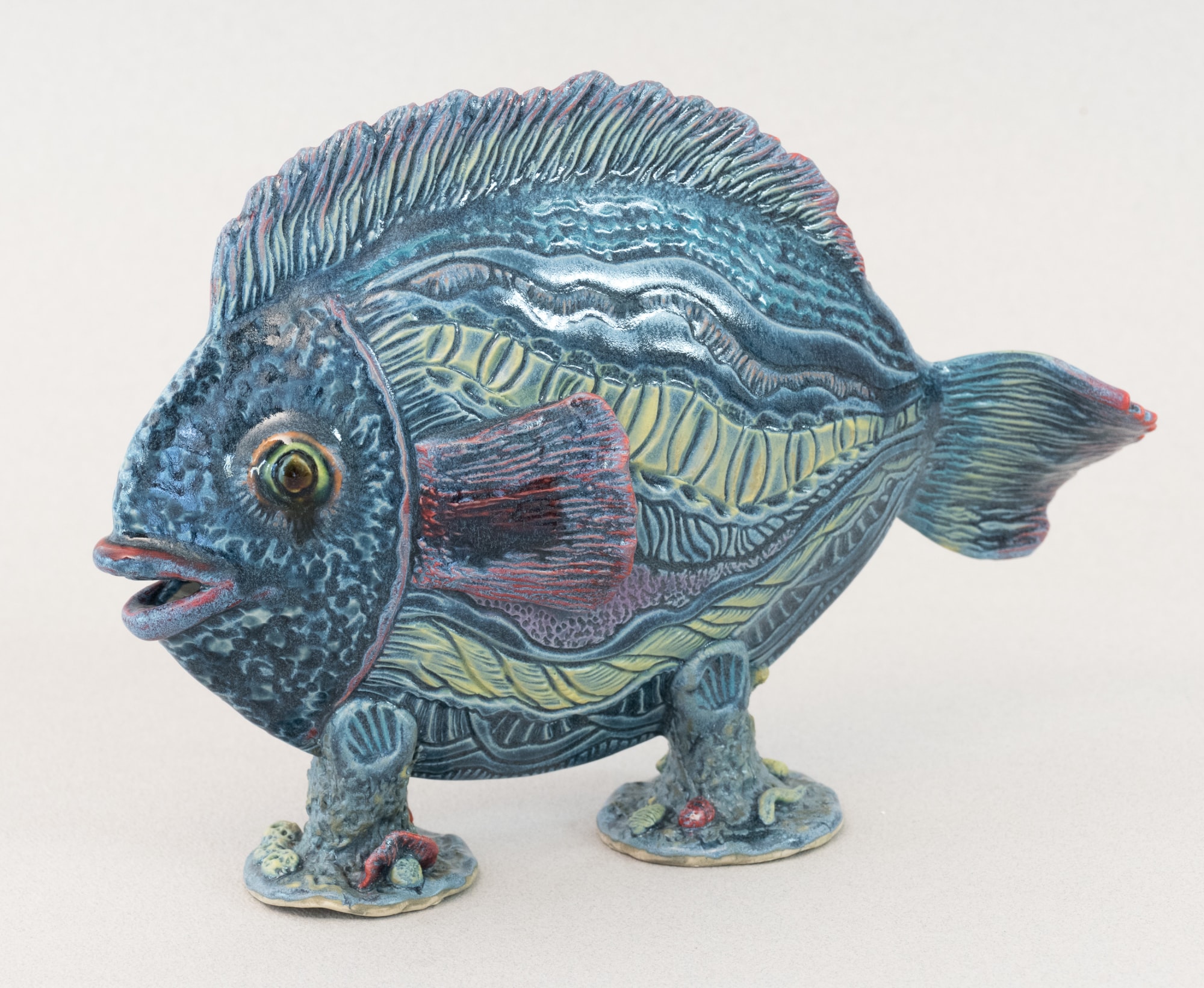 Designs reflect the artist’s observation of nature and years of scuba diving, plant life, textures and terrain. Hand carved and impressed textures to create two different, original designs on either side, painted underglazes, glaze trailed and overall glaze dip. This piece was created with B-mix, a white, Cone 6, mid-fire clay fired in oxidation to 2200ºF.