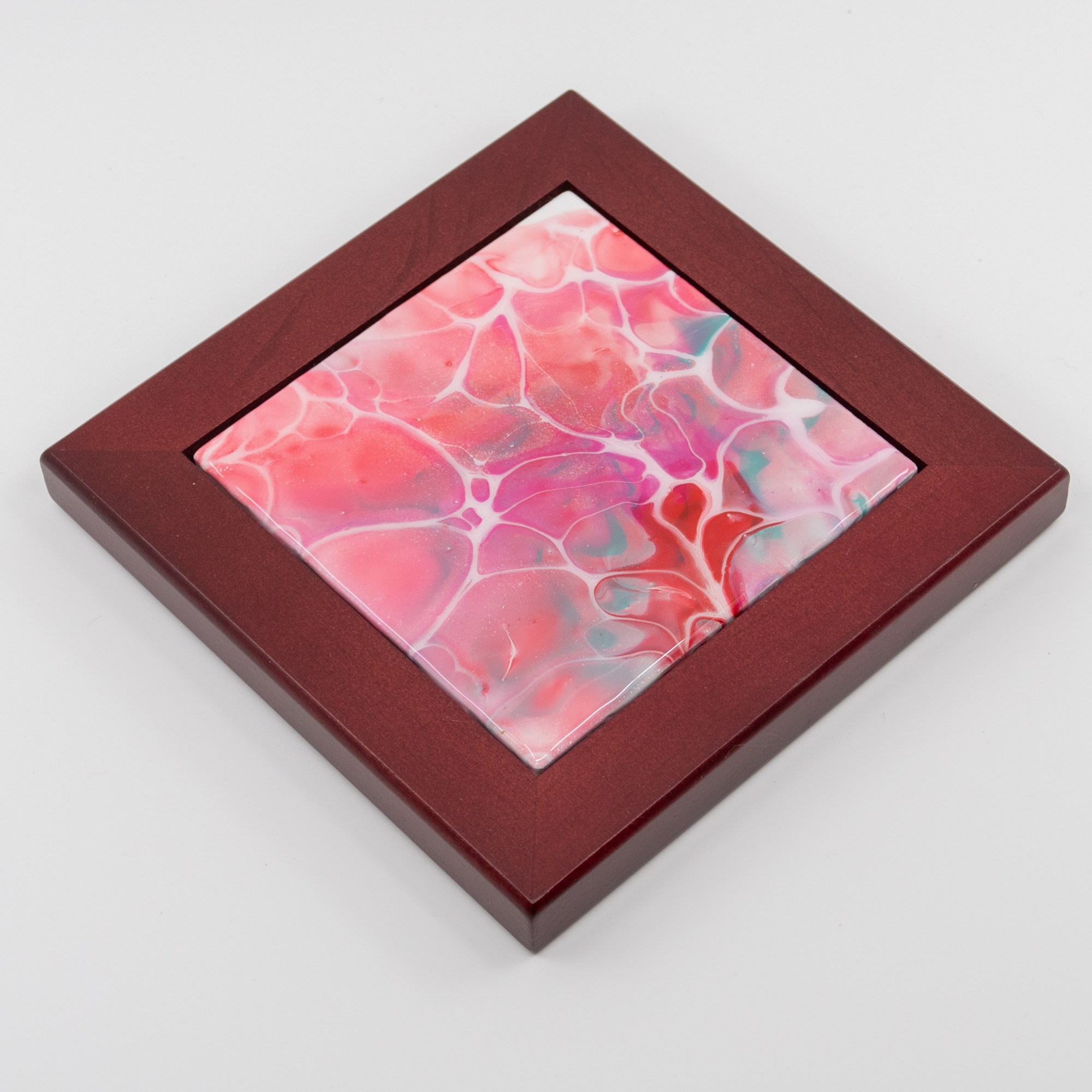 This is created with Stone Coat Resin over the painting. The pieces can be used as wall art an/or taken down and used as a hot plate coaster up to 450*F degrees. To clean, do not immerse in water, but just wipe with a wet, squeezed out sponge. This piece serves to be both functional and beautiful.
