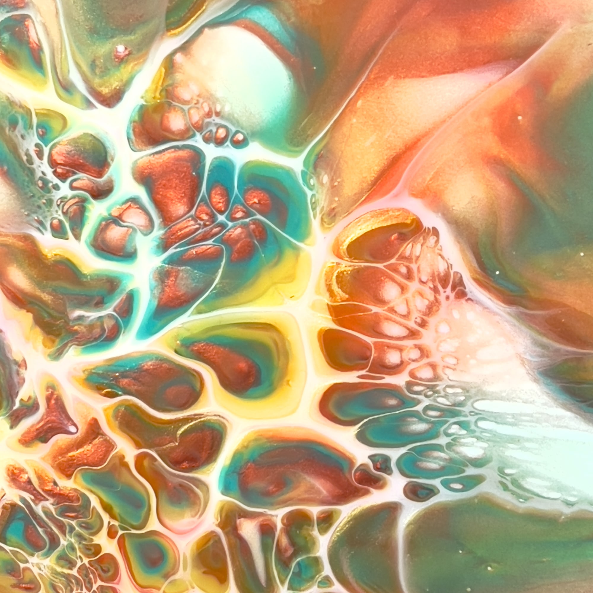 These layers are applied on the tile, then the cell activator is swiped or spun on these layers using a banding wheel to expand the design and produce cells. When used, the pigments create a luminescent or iridescent effect within the painting. After three weeks of drying, the piece is resined to bring back the vibrancy of color and give the painting a glass-like protective coating.
