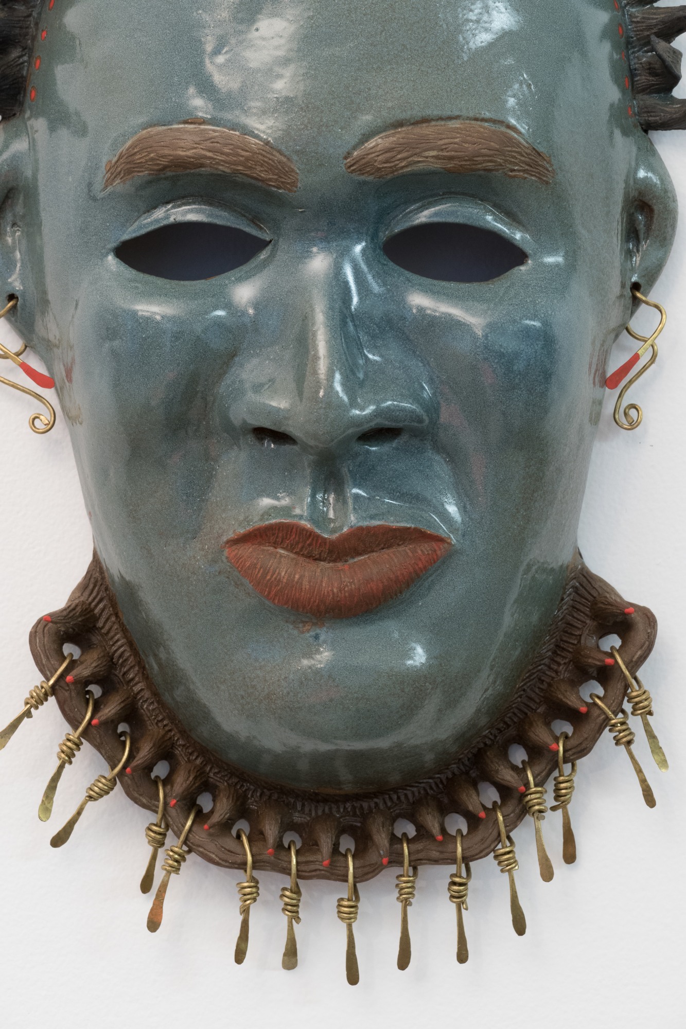 This carved, full-sized mask is an original design created in a dark mid-fire, cone 6 clay, fired in oxidation to 2200ºF. Areas were waxed to reveal the beauty of the chocolate clay and resist the blue glaze. Wires were added and red acrylic paint accents the mask to make this a great mixed media piece . Wired for hanging.