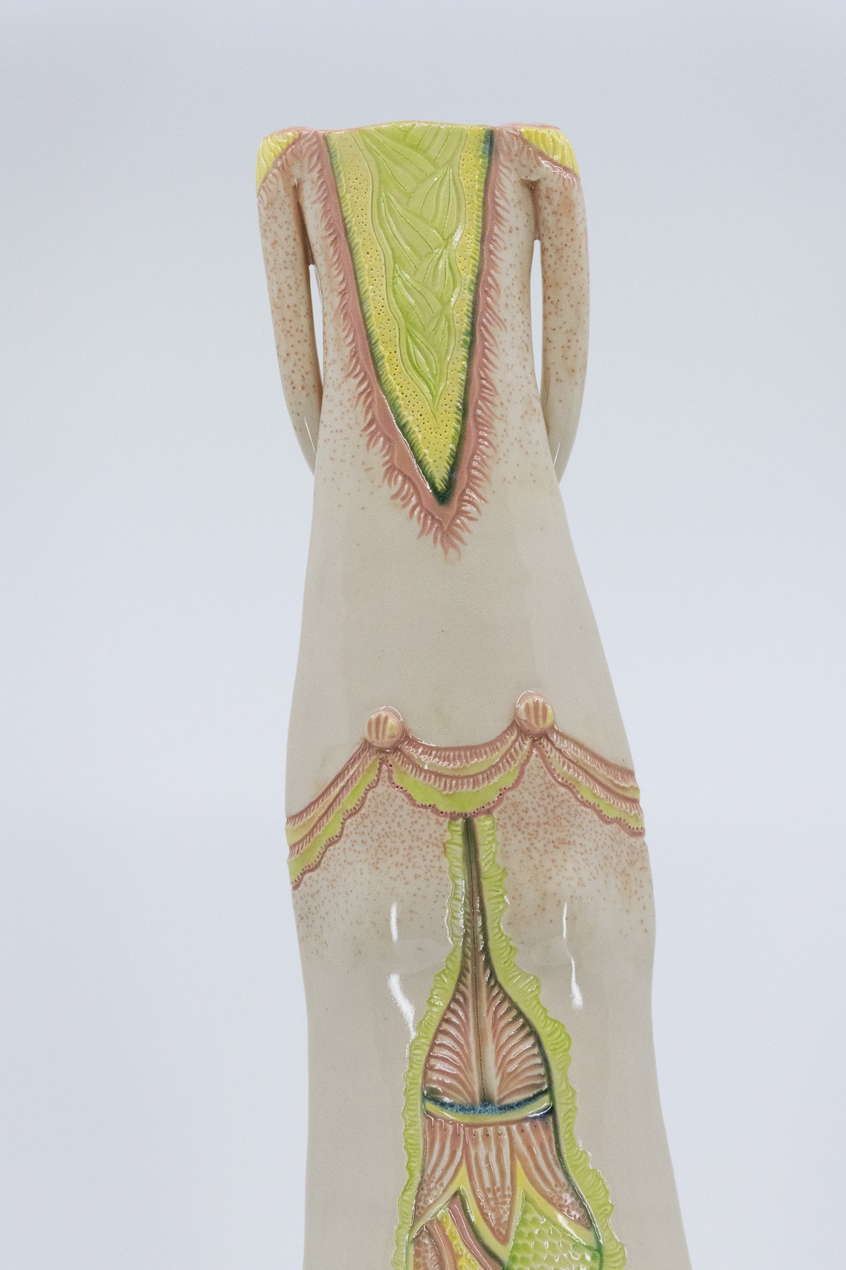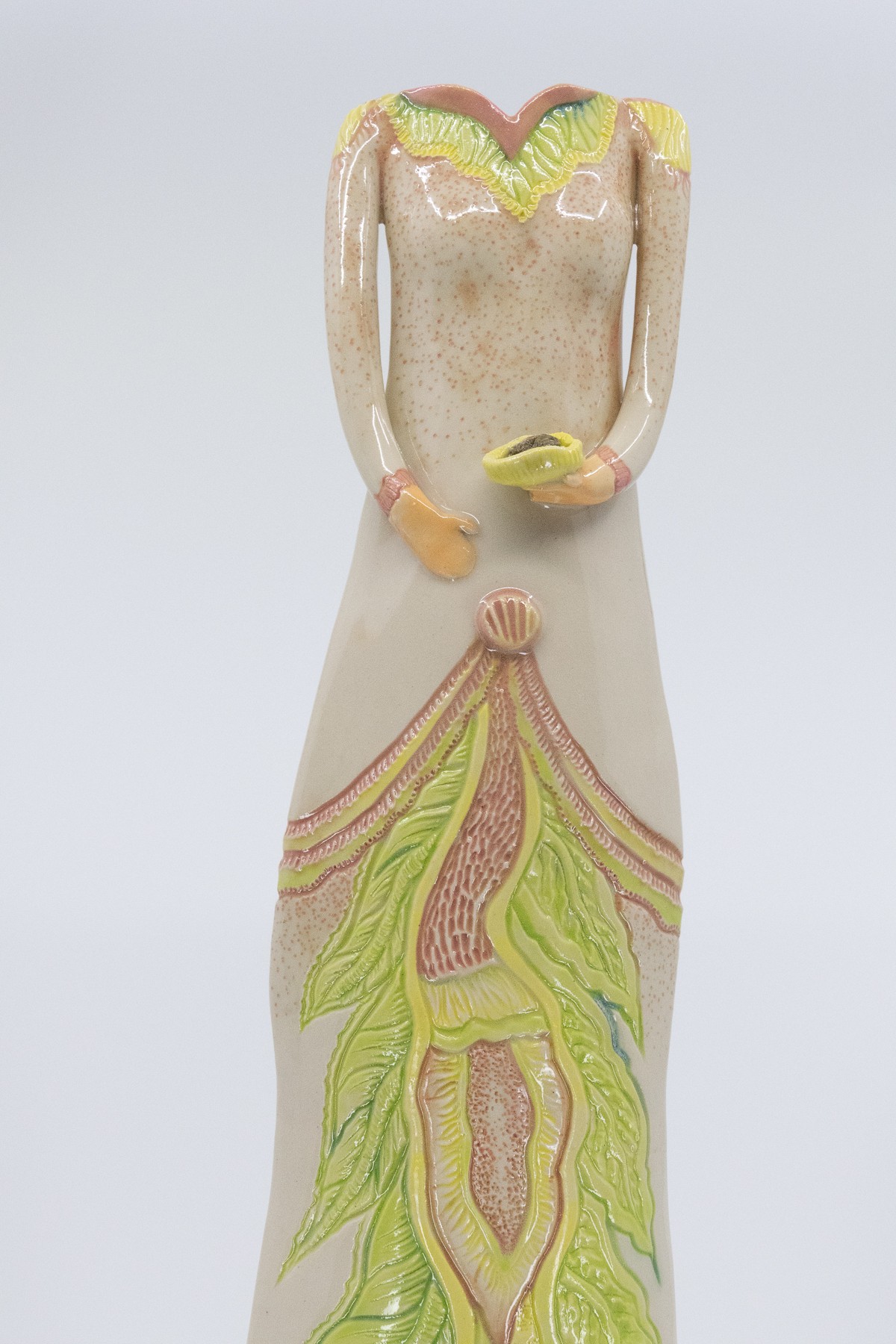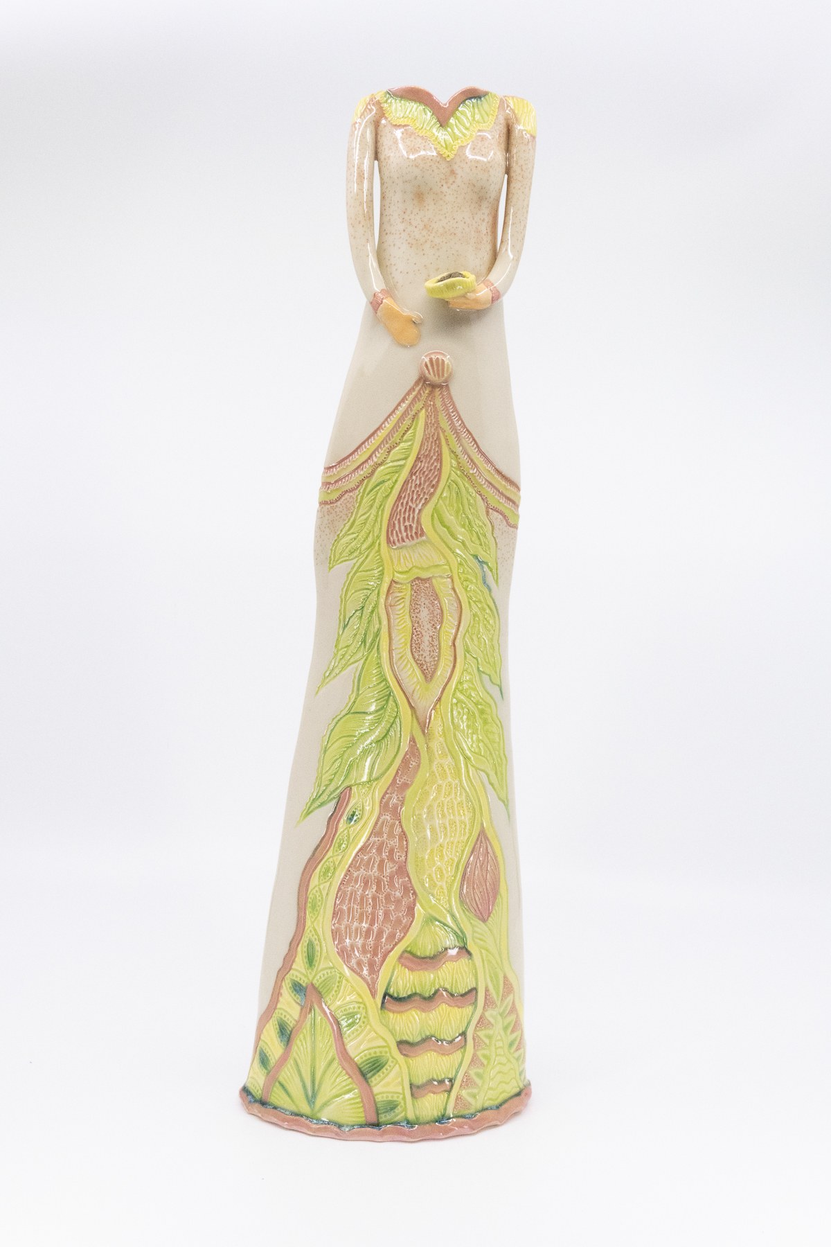 Tall and slender lady with a vase opening (1.5" x 0.75") for holding items like a few longer stemmed flowers (tulips, daisies, roses, gladiolus, baby's breath, Queen Anne's lace, etc.) or long ostrich or peacock feathers.