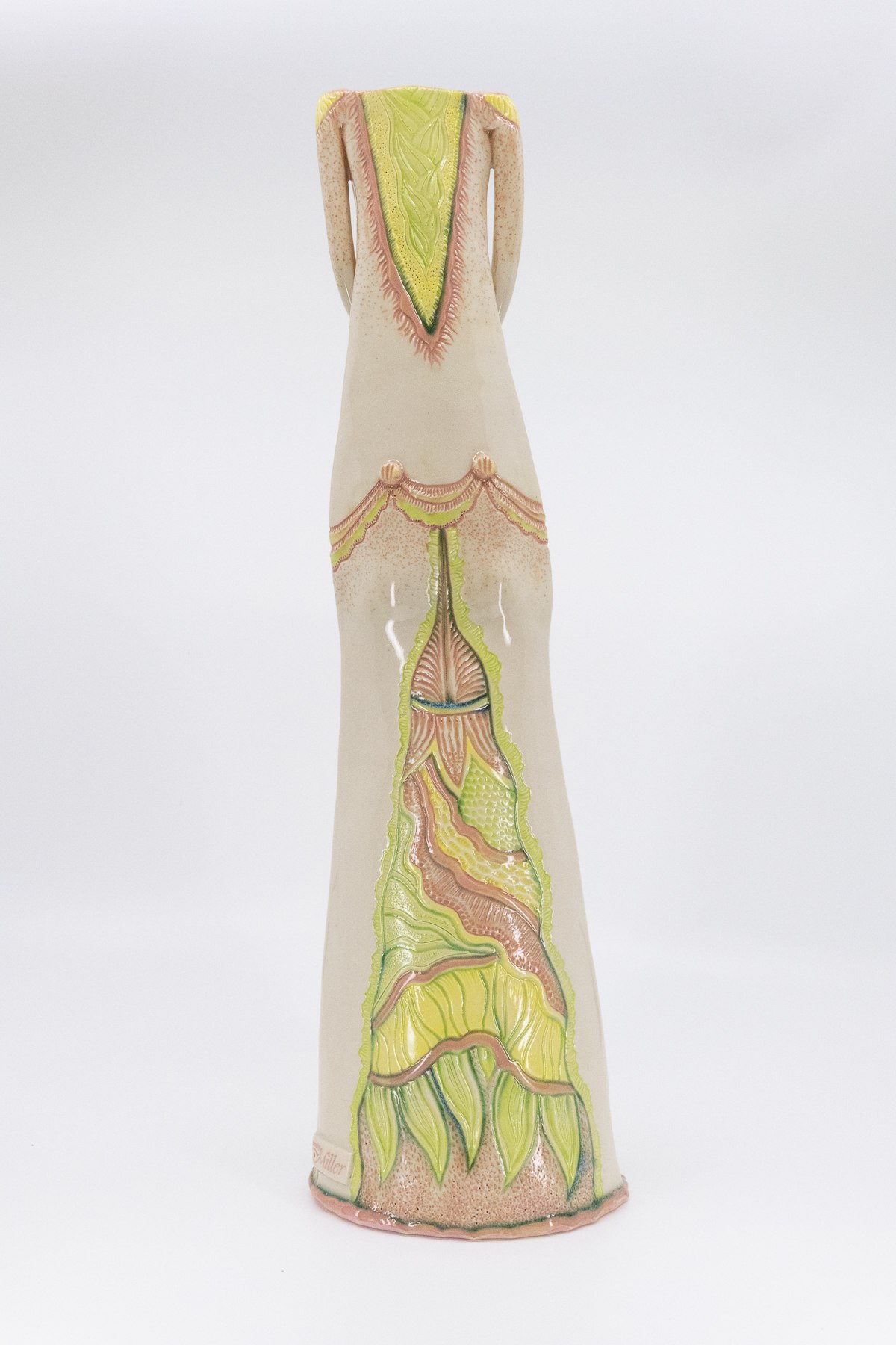 Slab construction with cone 6, B-Mix Clay. Hand-carved intricate, original design, with stamped impressions on the sides. Front and back carved details are ideal for displaying in a location to be seen from all sides. Underglazes hand-painted on and wiped back in some areas to enhance the texture.