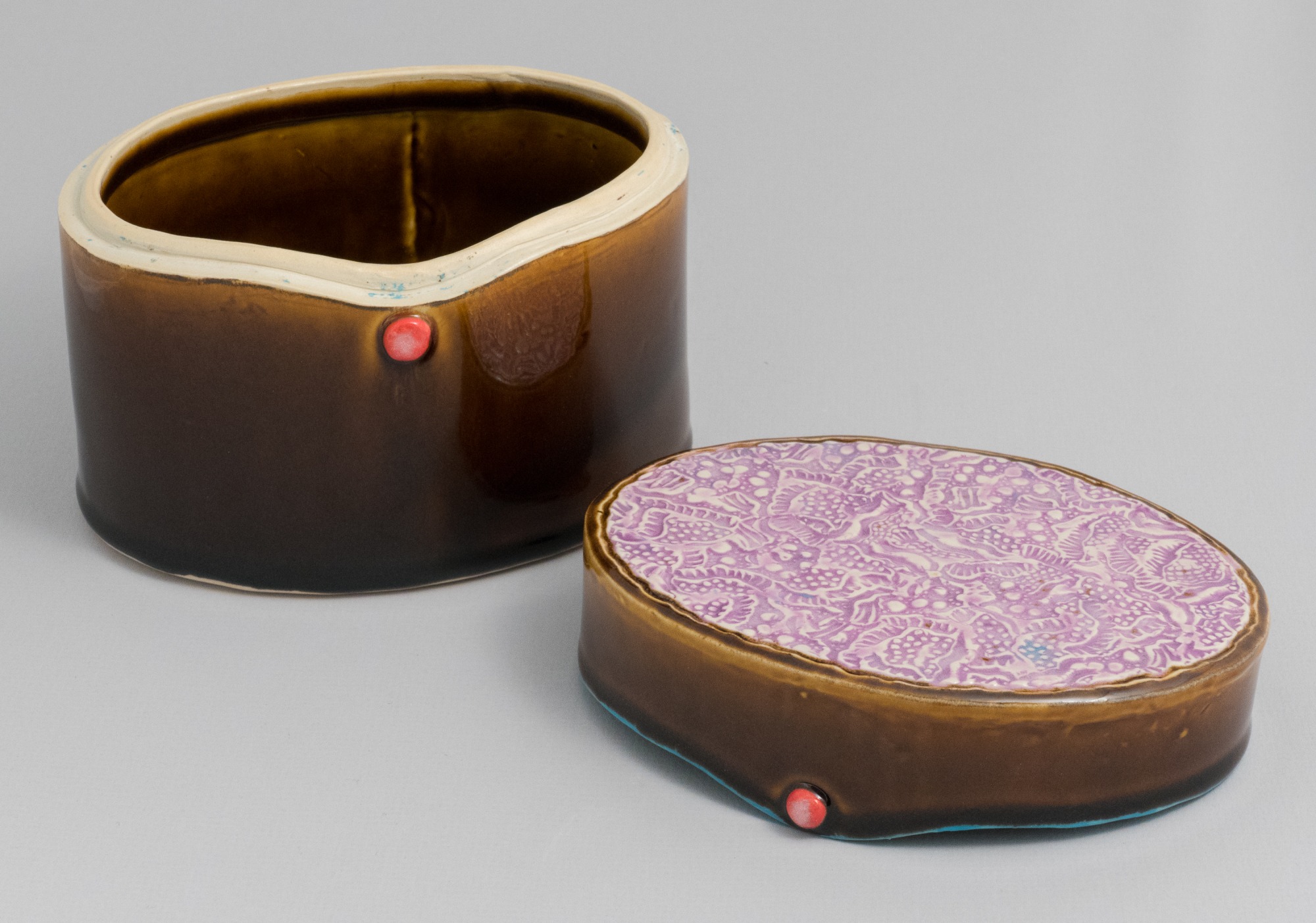 Lidded container for storing personal items and household objects. The impressed design reflects the artist’s observation of nature, years of scuba diving, plant life, textures and terrain.
