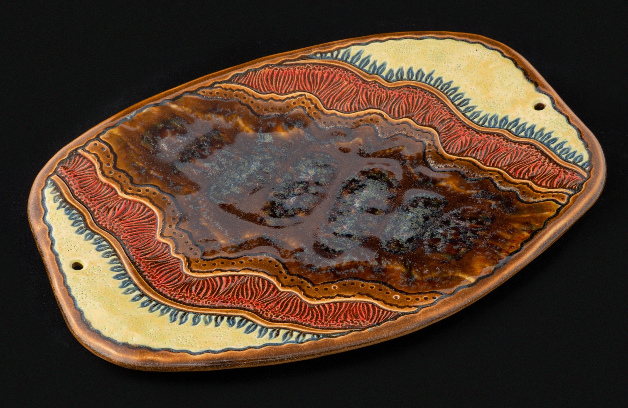 Handbuilt slab construction created in a slump mold giving it a shallow curve to the platter edges. Made with B-mix, a white, Cone 6, mid-fire clay fired in oxidation to 2200ºF. Carved with an original design; Underglazes, glaze trailed, waxed in some areas to resist the dipped overall glaze.