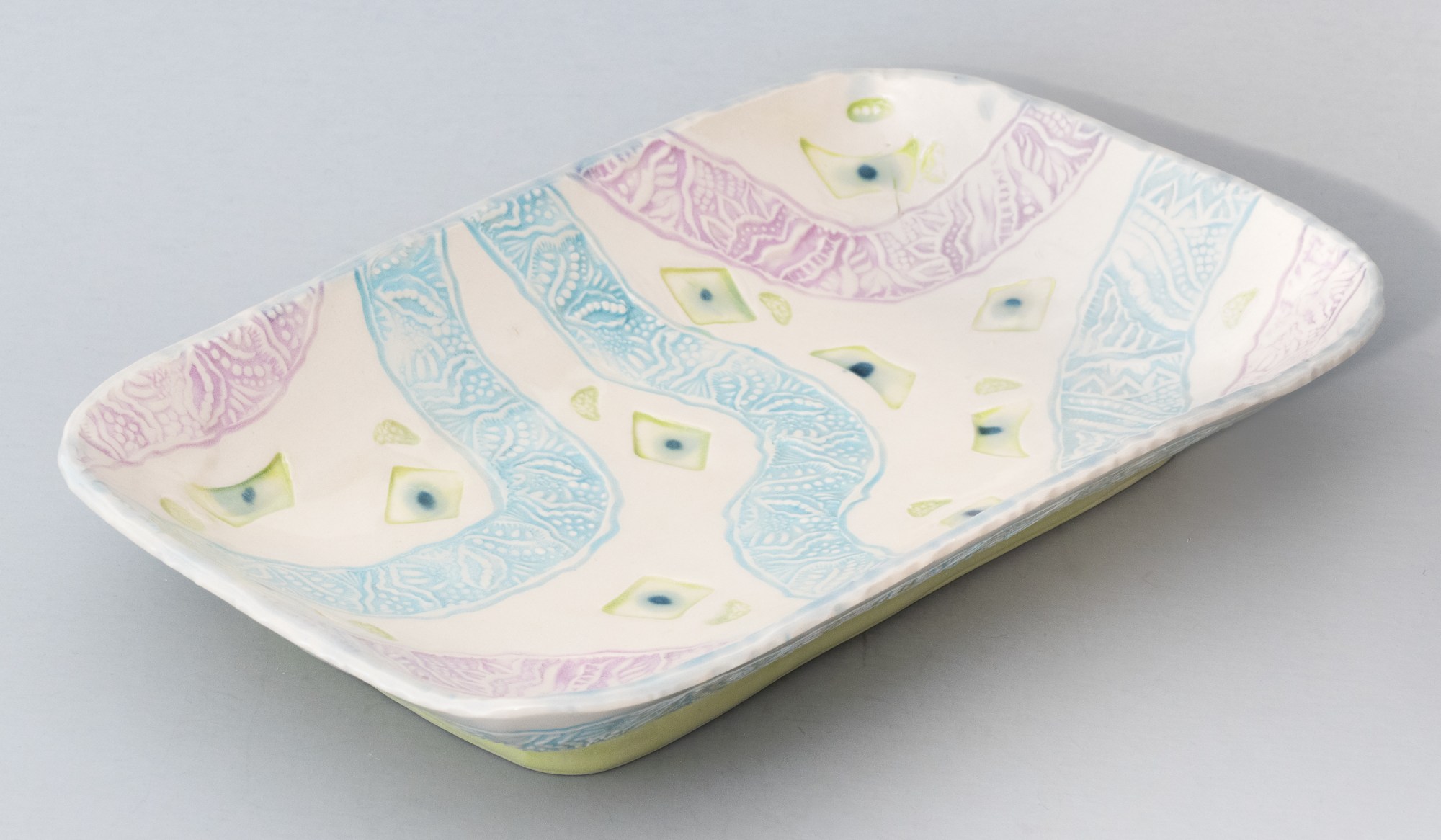 Handbuilt slab construction created in a slump mold with B-mix, a white, Cone 6, mid-fire clay fired in oxidation to 2200ºF. Carved and impressed design elements; Underglazes painted on and sponged back, glaze trailed and dipped overall glaze. These glazes are food-safe, dishwasher safe and microwavable.