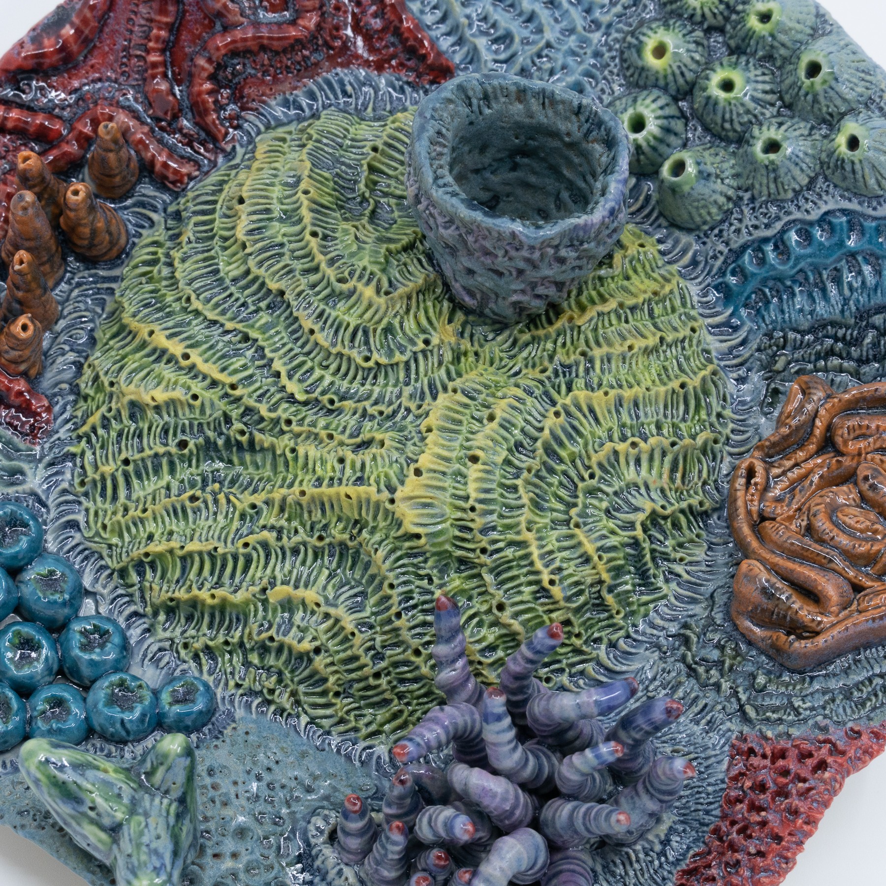 Sculptural handbuilt wall art; cone 6 B-Mix clay; underglazes, glaze trailed and glaze dipped; fired in oxidation; wired for hanging.