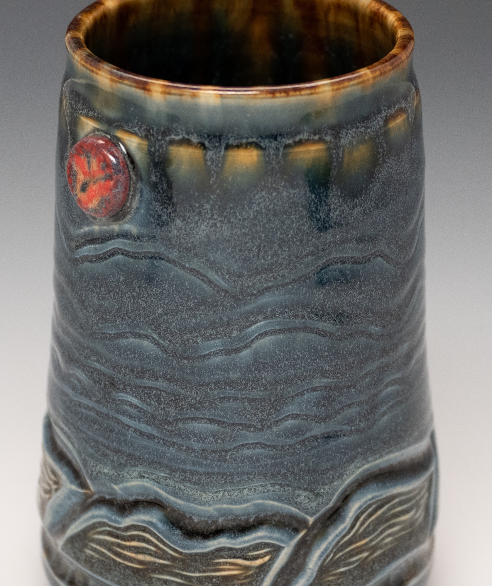 Wheel thrown construction; Hand carved; Underglazes; Glaze trailed with a final overall glaze dip. Cone 6 mid-fire clay fired in oxidation to 2200ºF. This piece is food-safe, dishwasher safe and microwavable.