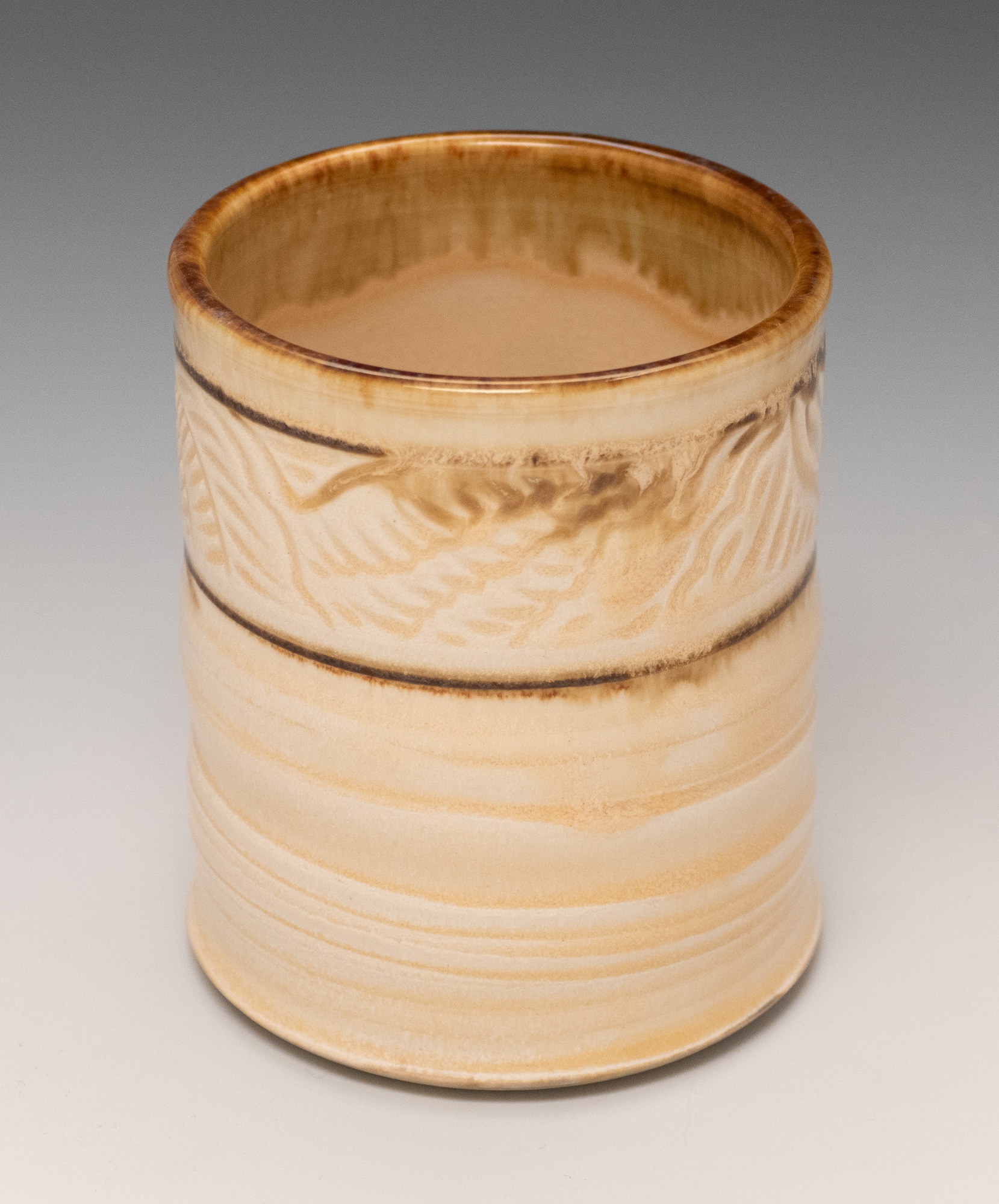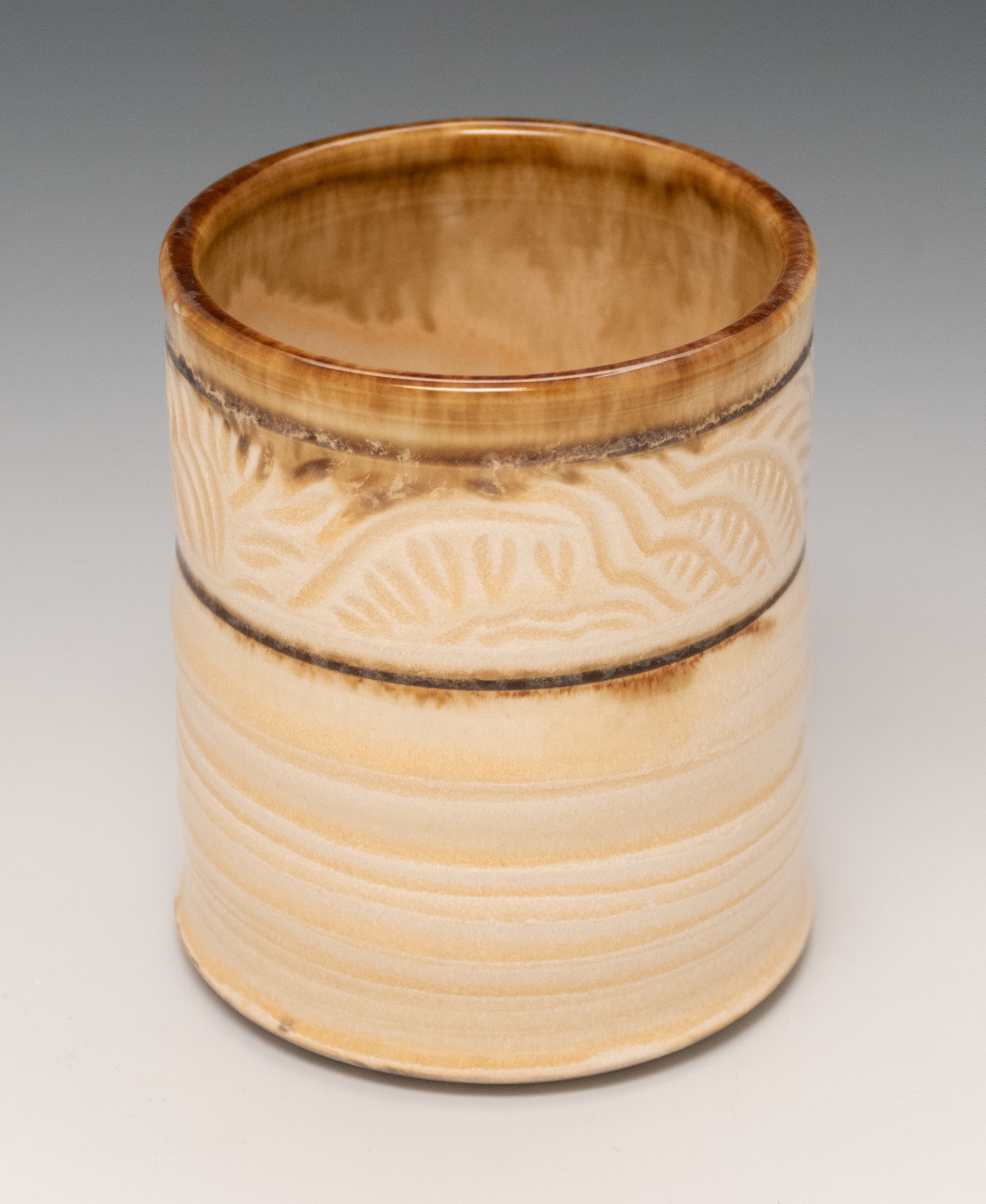 Wheel thrown construction; Hand carved original designs that extends around the cylinder; Glazed, Cone 6 mid-fire clay fired in oxidation to 2200ºF. This piece is food-safe, dishwasher safe and microwavable.