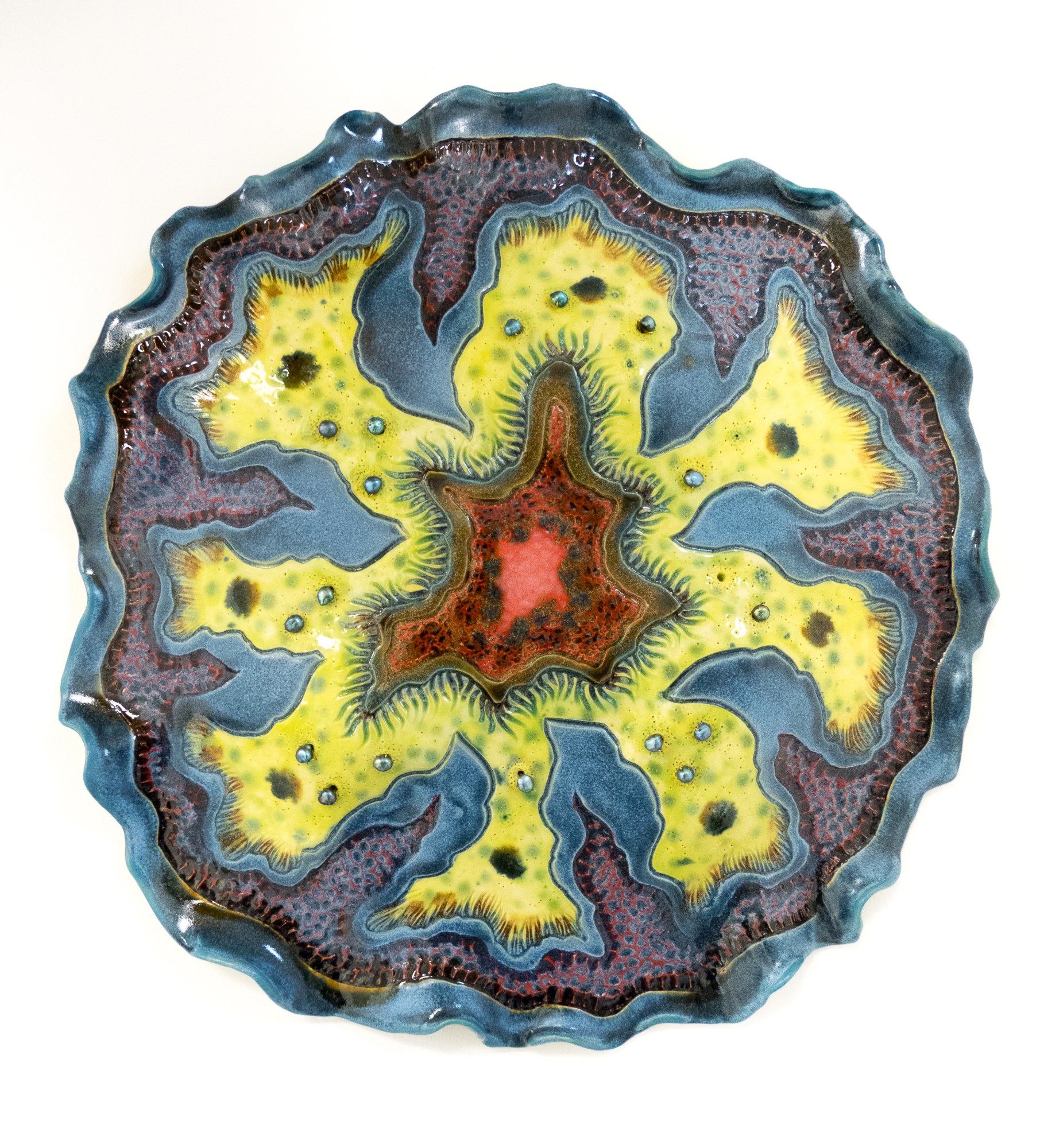 One of a kind, unique design reflects the artist’s observation of nature and years of scuba diving, plant life, textures and terrain. Created from a slab over a hump form, fluted and carved. Holes created for the beadwork and wired for hanging. Underglazes, glaze trailed, waxed in selected areas to resist the final graze dip and control the purity of color in the pre-glazed areas, and glaze dipped. B-mix, a white, Cone 6, mid-fire clay fired in oxidation to 2200ºF. Blue pearlescent beads wired into the piece.