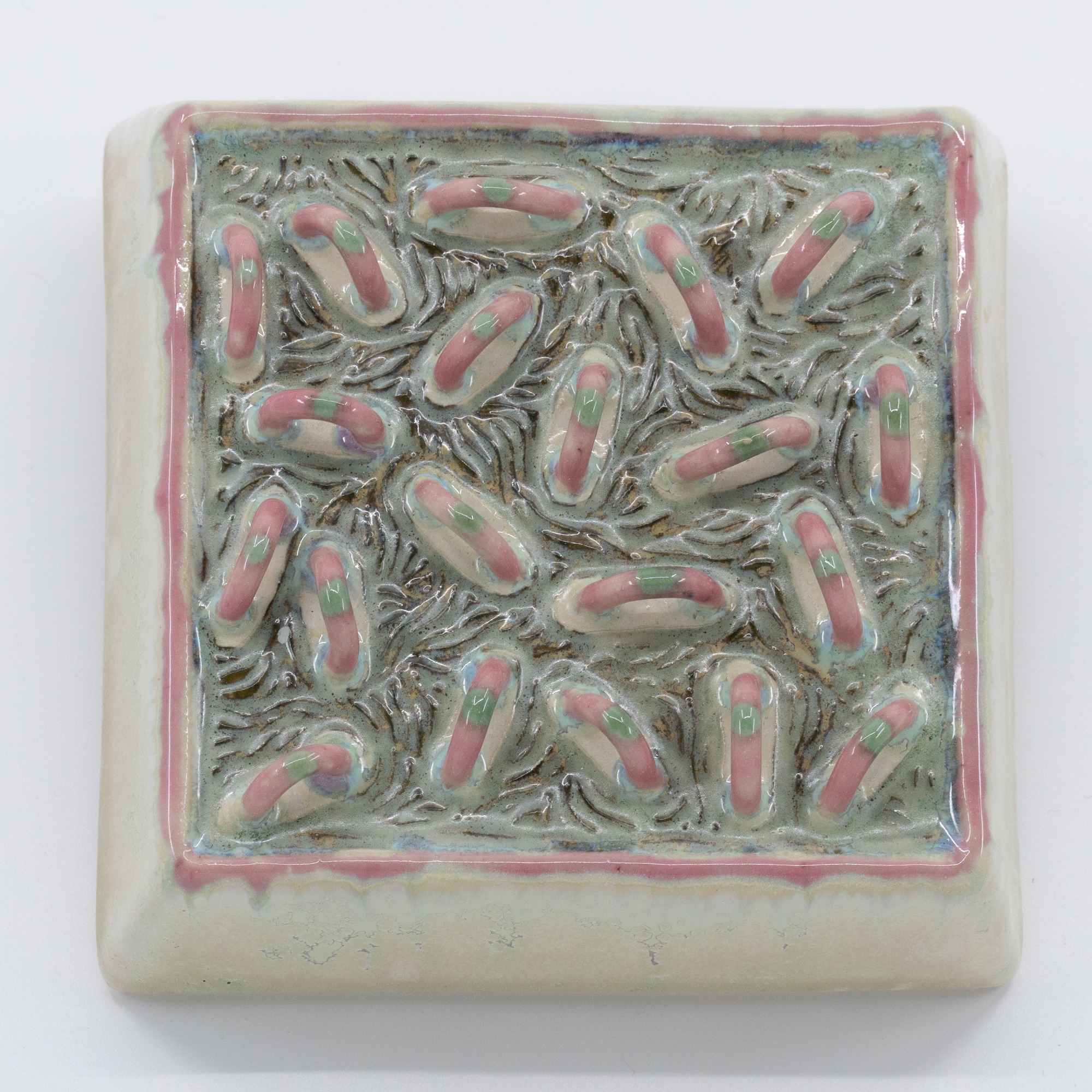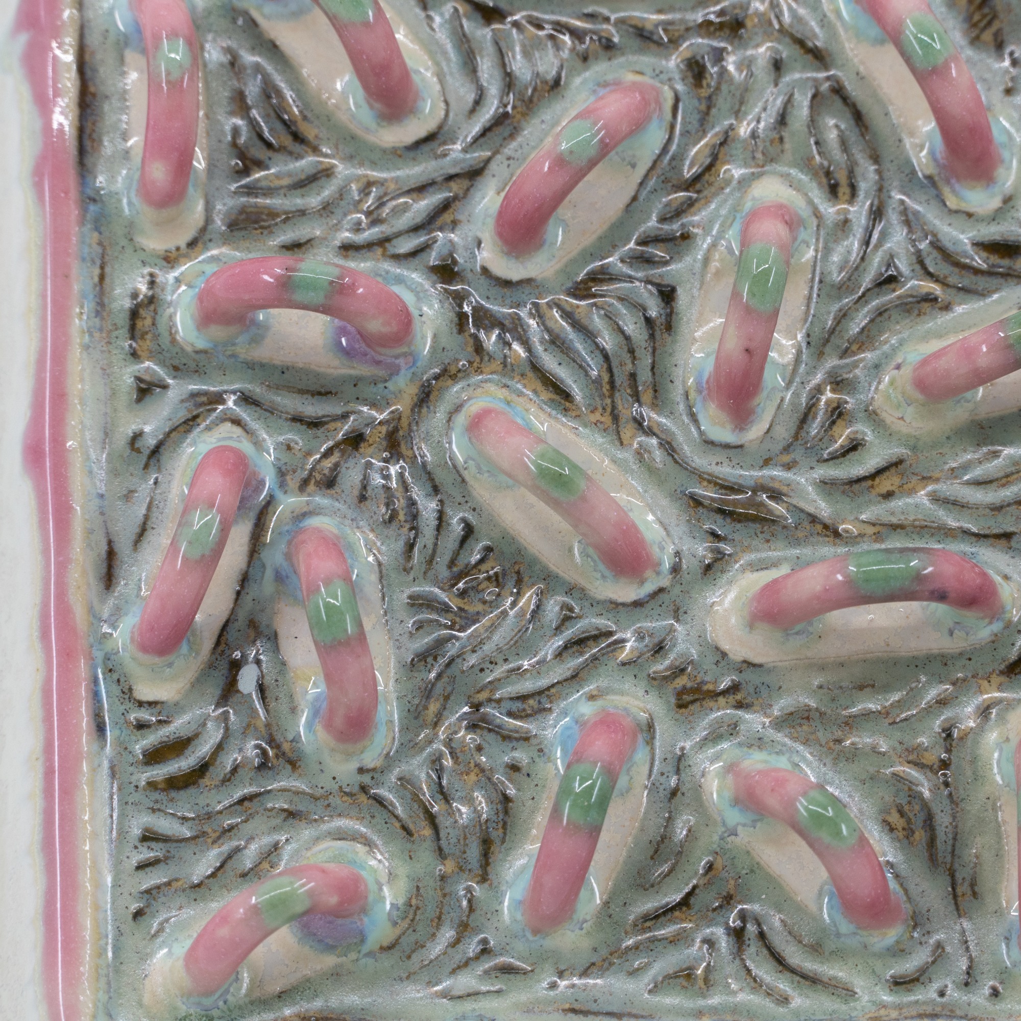 Hand slab built wall hanging created in a plaster-cast drape mold, then carved with alterations added. Nichrome wire embedded in the clay. Black slip painted on in selected areas, a variety of glazes were glaze trailed to create this unique combination of colors. The top panel was waxed to resist the sides that were glaze dipped with my newly tested and mixed variation the gives a pearlescent quality to the surface. Beads added & glued in.