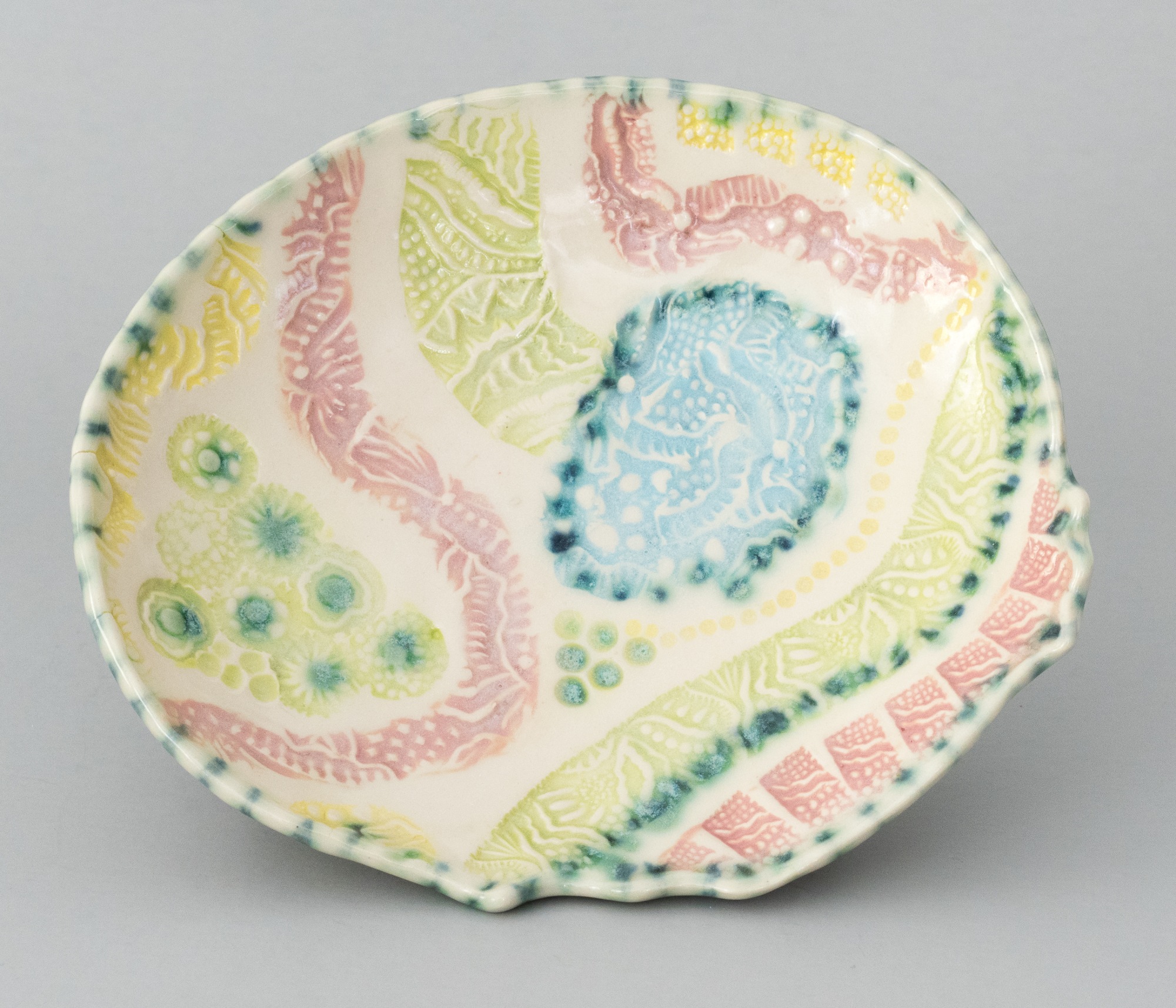 This piece is food-safe, dishwasher safe and microwavable. One of a kind, unique designs reflect the artist’s observation of nature and years of scuba diving, plant life, textures and terrain.