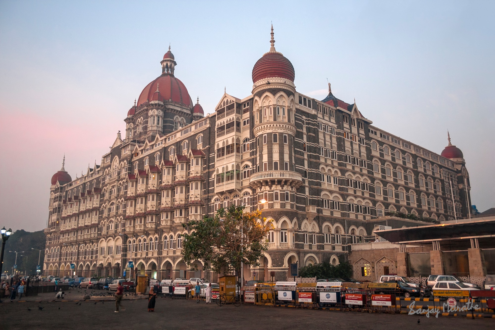 This is a photograph of the old wing of Taj Mahal Palace hotel in Mumbai. It depicts the grand building in all glory. I photographed it at dawn, with a hint of pink still visible in the sky. There are no distractions in the foreground, which gets quite crowded during the day.