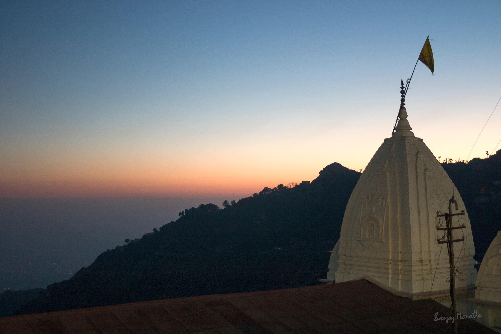 I captured this serene moment just after sunset in Mussoorie, Uttarakhand. The temple stands prominently against the mountain's silhouette, set against a sky that transitions from warm sunset hues to deep blue. A flag flutters gently in the evening breeze, while rolling hills and distant trees add depth to the tranquil backdrop.