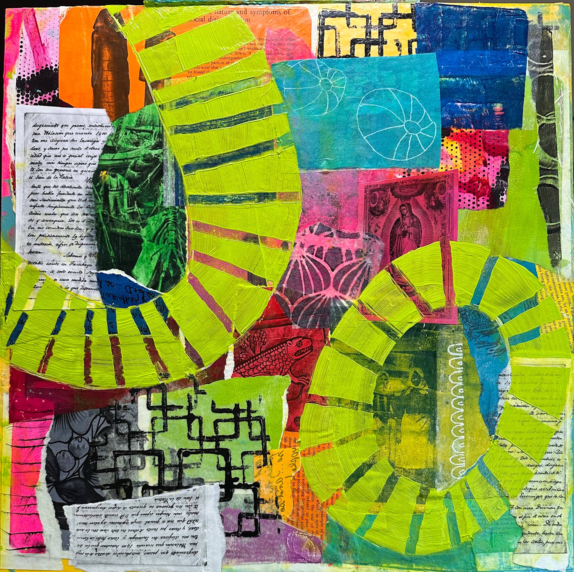 Colorful abstract collage with green spirals, vivid patches, and mixed textures
